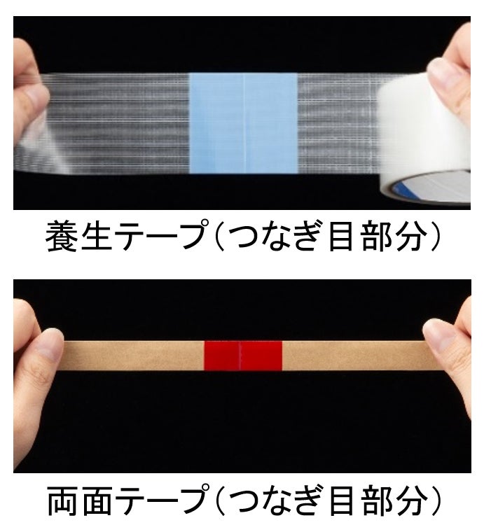 こうして仕上がった両商品には、1巻あたり1ヶ所つなぎ目部分が含まれるものとなりました。この“つなぎ目”は糊残り、糊が薄い部分が発生する可能性があり商品の特性が保証できないため、対象部分を一目で判別できるよう使用できる部分とは異なる色のテープで可視化し、使用不可である旨を商品のパッケージ上で訴求しています。