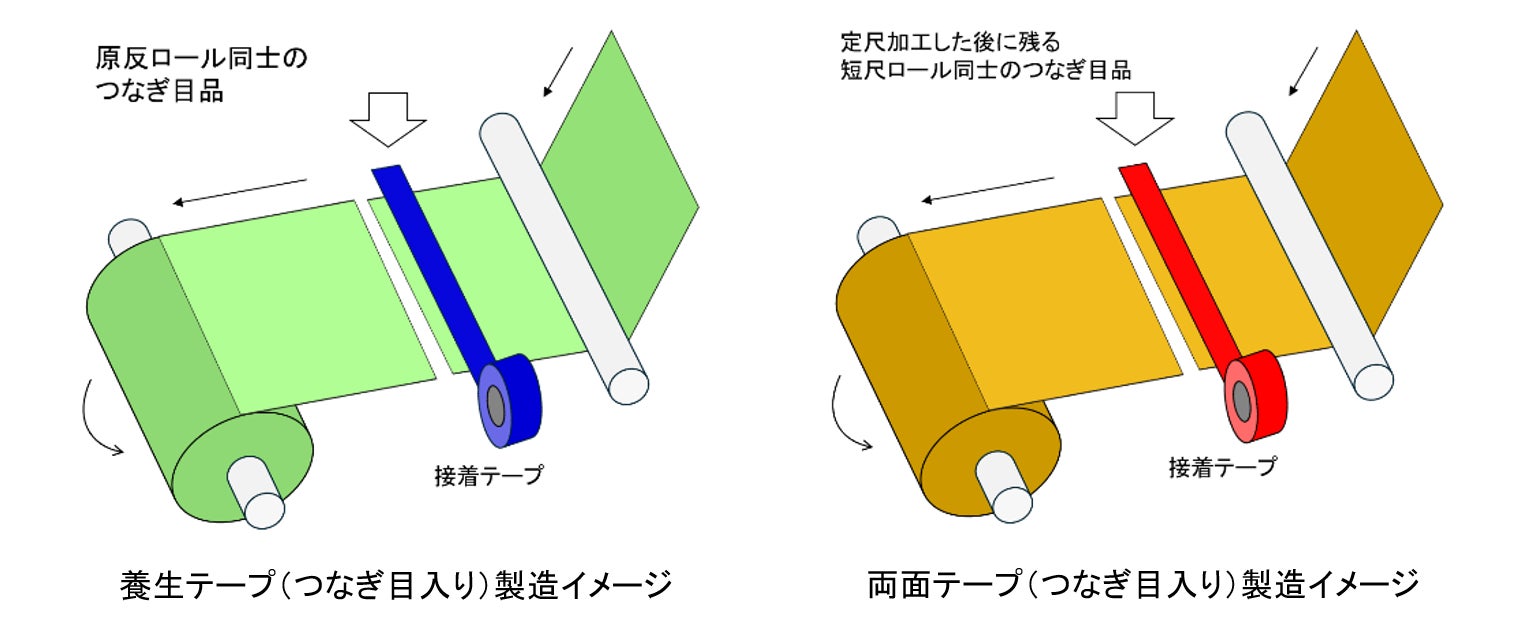 養生テープは生産効率を上げるため、原反ロール(※1)同士をつなぎ合わせて製造しますが、まずは原反ロールのつなぎ目部分に接着テープを使用します。次に、つなぎ目が入った原反ロールで定尺加工を行いますが、一部つなぎ目が入ってしまうロールが発生するため、従来は“つなぎ目入り”の原反ロールを一定数たまった段階で廃棄していました。そこで「Go Ethical」品の養生テープでは、つなぎ目が入っているロールを廃棄せず通常品同様の規格で加工を行い、“つなぎ目入り”品として商品化しました。