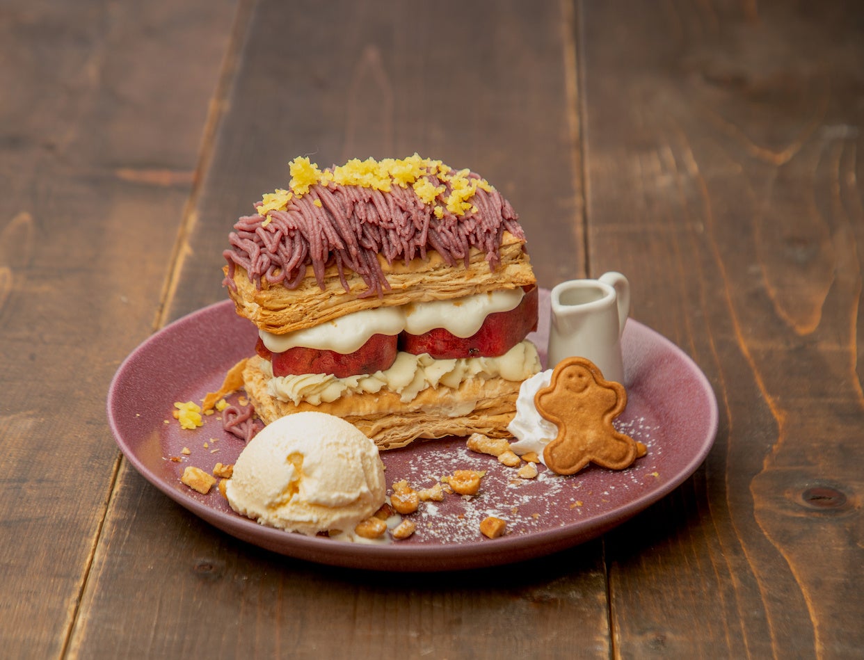 低温でじっくり焼いた安納芋を3種のクリーム(紫芋、さつま芋、クリームチーズ)と合わせ、可愛いモンブラン風のパイサンドにしました。
