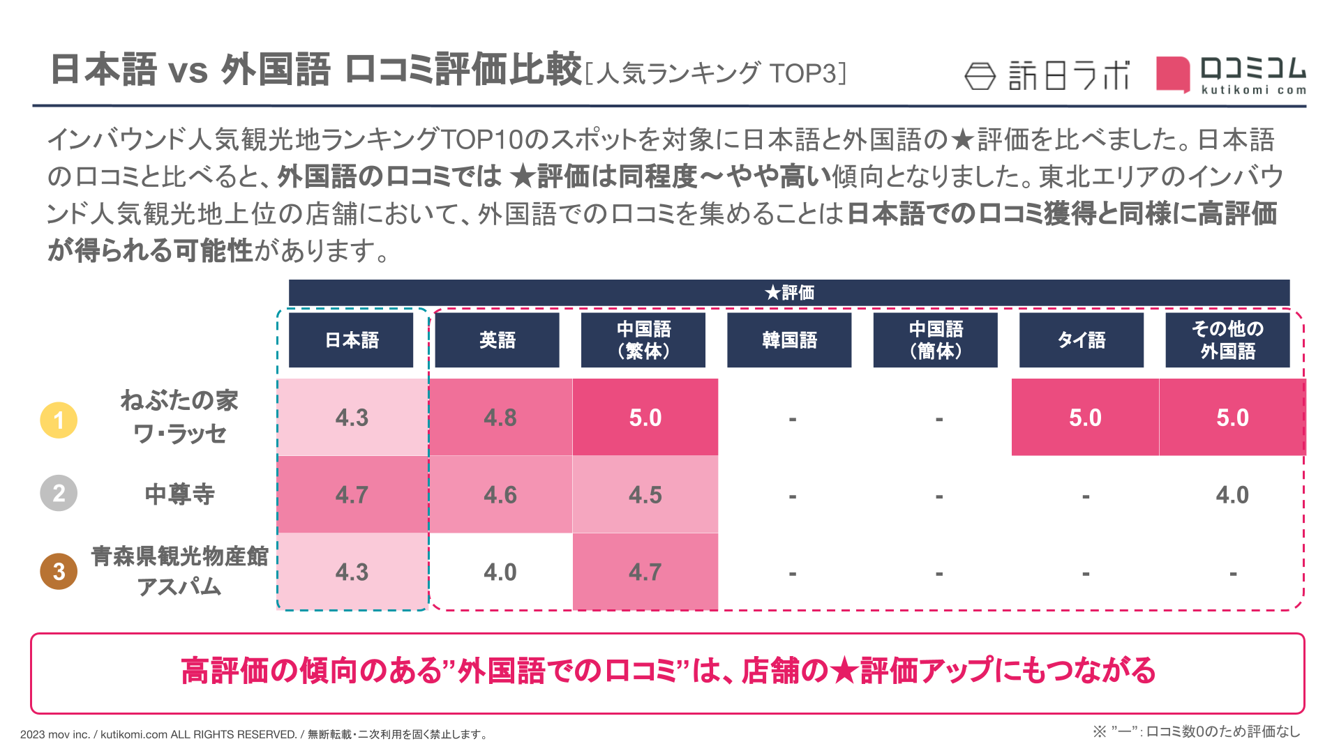 日本語の口コミと比べると、外国語の口コミでは ★評価は同程度〜やや高い傾向となりました。東北エリアのインバウンド人気観光地上位の店舗において、外国語での口コミを集めることは日本語での口コミ獲得と同様に高評価が得られる可能性があります。