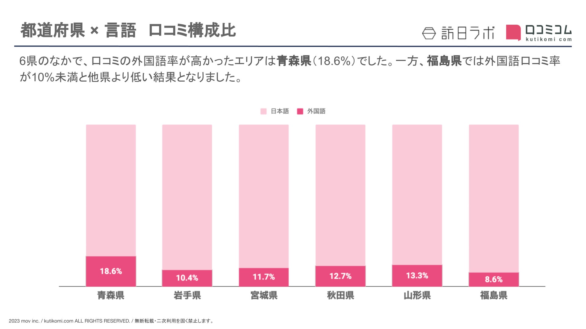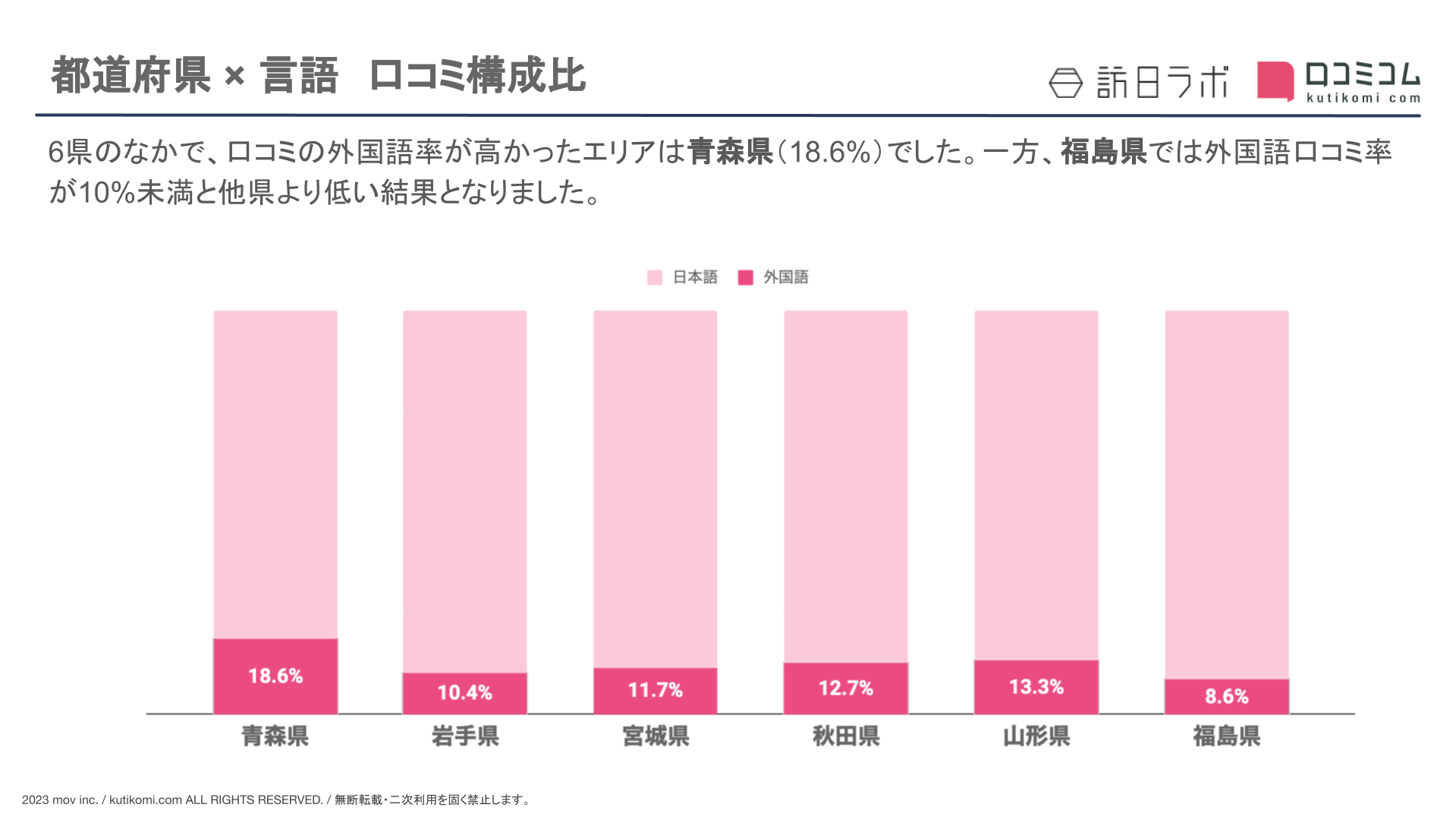 6県のなかで、口コミの外国語率が高かったのは青森県(18.6%)でした。一方、福島県は外国語口コミ率が10%以下と他県より低い結果となりました。