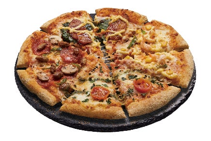 ポイント:1.マヨシュリンプ 2.マルゲリータ 3.ドミノ・デラックス 4.炭火焼チキテリの組み合わせを1枚のピザで楽しめます。