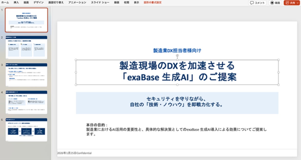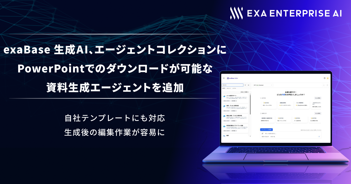 株式会社エクサウィザーズ(東京都港区、代表取締役社長CEO:春田 真、以下エクサウィザーズ)のグループ会社である株式会社Exa Enterprise AI(東京都港区、代表取締役:大植 択真、以下Exa Enterprise AI)は、国内市場シェア1位を獲得した*法人向け生成AIサービス「exaBase 生成AI」のエージェントコレクションに、PowerPointでのダウンロードが可能な資料生成エージェントを追加しました。自社テンプレートにも対応し、資料を生成した後のデザイン調整や編集作業が容易になります。