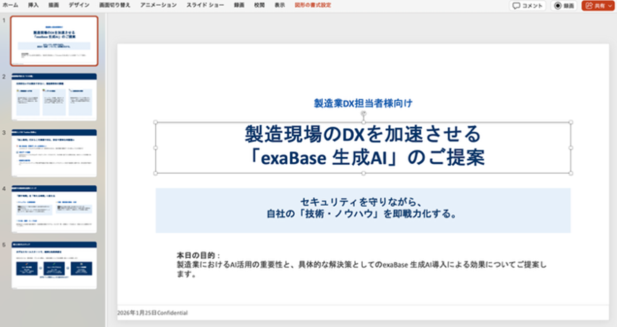 自社専用のスライドマスター(テンプレート)を反映させてスライド資料を生成することが可能です。自社デザインを踏まえたうえで生成されるため、「AIが作ったデザインを自社フォーマットに修正する」という作業が発生しません。