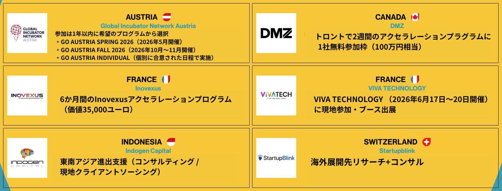 厳正な審査を経て、全テーマ共通の基準で最も高い評価を得た企業には「GRAND PRIZE」を、各テーマ内のピッチ登壇企業から、テーマ賞「THEME AWARD」を各1社ずつ選定します。また、各ピッチパートナーに選ばれた企業には「GO GLOBAL PRIZE」をご用意しています。受賞企業の皆さまには、海外イベントへの参加や国際的な投資家・起業家との交流など、グローバルに挑戦するための貴重な機会が提供されます。また、各スポンサー企業が選定する「SPONSOR PRIZE」では、各種特典が贈られます。