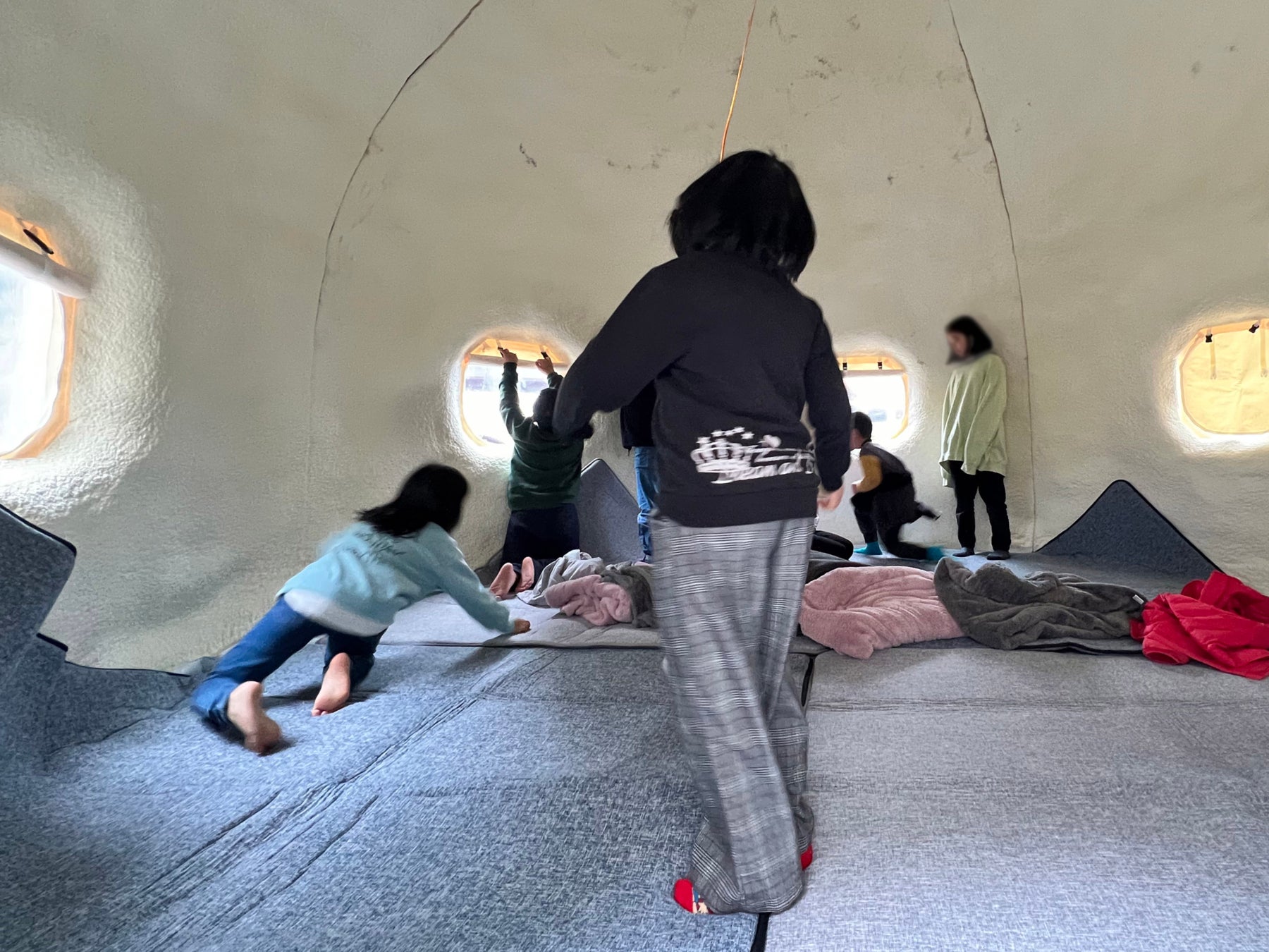 インスタントハウス・パージ型は小学校の駐車場スペースに設置し、避難所の共有スペースとして子どもたちの憩いの場となりました。15㎡の広さと4mの天井高の特徴から、5~10名が談話したりカーペットを敷いて寝転がって遊んだり、ゆっくり寛げる空間になります。