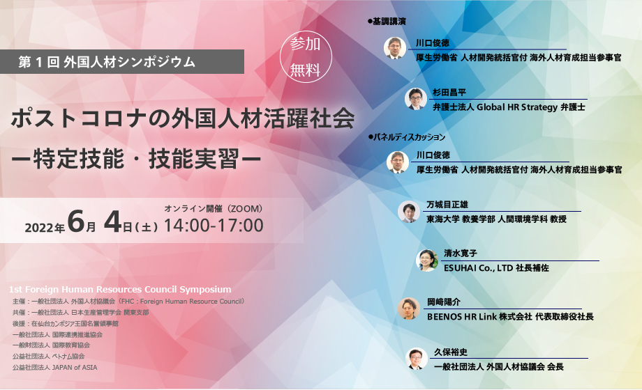 BEENOS株式会社(東証プライム:3328)の連結子会社で、SaaS型越境HRプラットフォーム「Linkus(リンクス、https://linku-s.com/)」を運営し、外国人雇用をテクノロジーで支援するBEENOS HR Link株式会社(以下「BEENOS HR Link」)の代表岡﨑陽介は、2022年6月4日(土)、一般社団法人外国人材協議会(以下FHC)が主催し、産官学民の第一線で活躍する専門家を招いて講演とパネルディスカッションを行う「第1回外国人材シンポジウム」にパネリストとして登壇いたします。無料で参加できるオンライン形式ですので,是非お気軽にご参加下さい。