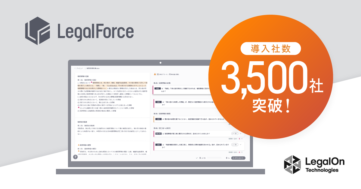 AI契約審査プラットフォーム「LegalForce」導入社数3,500社突破