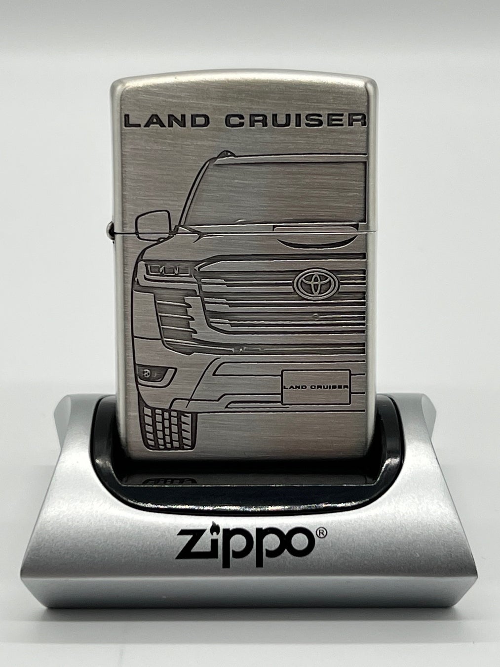 ランドクルーザーの特徴的なフロントデザインを高級感のある「彫り」の技法で施された高級感のあるZIPPOは、マットな質感がずっしりと手になじむ仕上がりです。背面にはランドクルーザーをイメージしたロゴデザインが刻印されています。