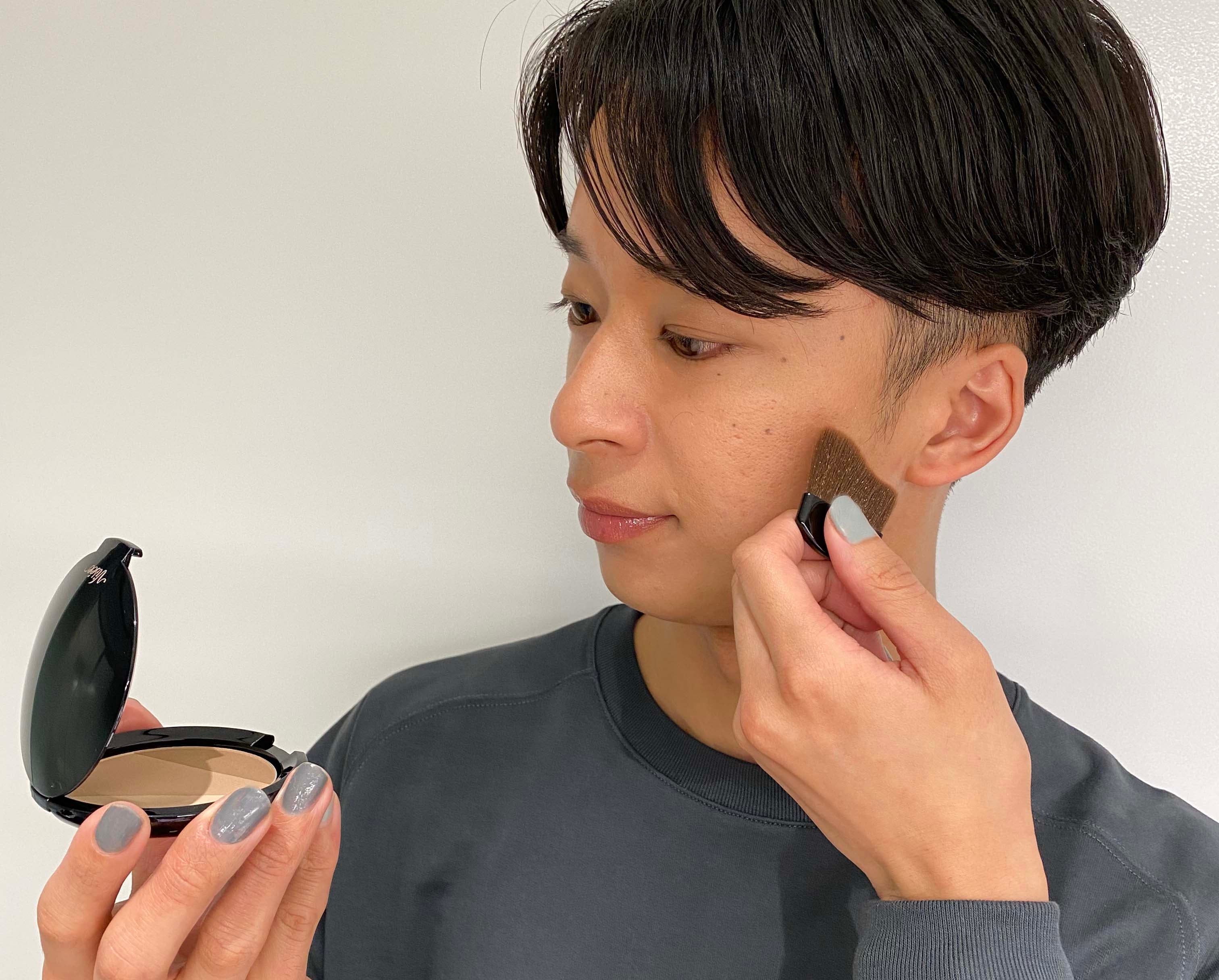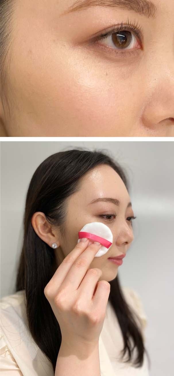 ファンデーションの仕上げに、擦れに強いフェイスパウダーを重ねます。ハイライトはTゾーンをメインに塗布することでマスクをしていても立体的な印象に。