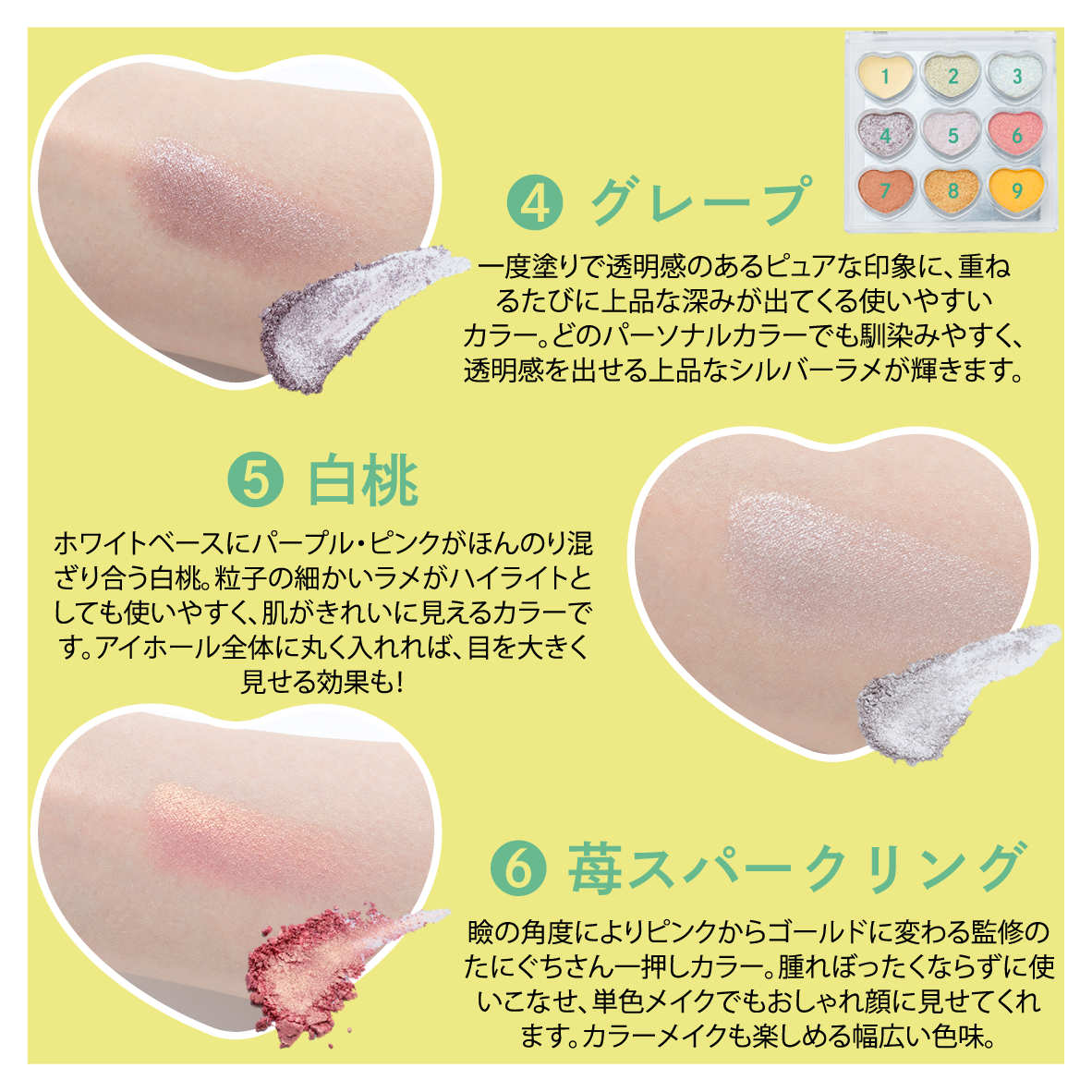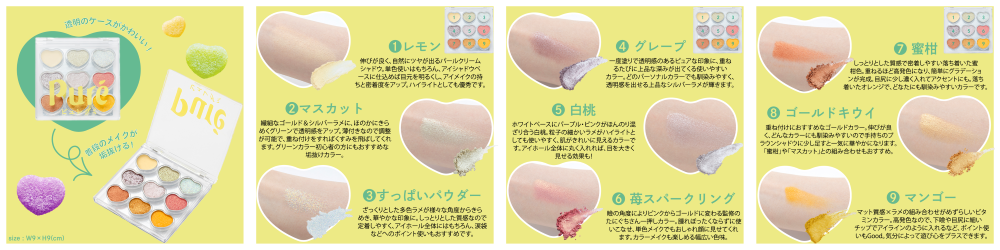 今回、ピュレグミをイメージしたラメ&グリッターのコスメパレット付きのブランドブックが登場します。コスメパレットはピュレグミの特徴である“すっぱいパウダー“とバラエティー豊かなフレーバーをラメ&グリッターで表現しています。人気のヘア&メイクアップアーティストのたにぐち翠彩氏がコスメの監修を務め、パレットひとつでいろいろなメイクができることはもちろん、普段使っているコスメにプラスすることで垢ぬける、使いやすさにこだわったカラーリングを揃えました。