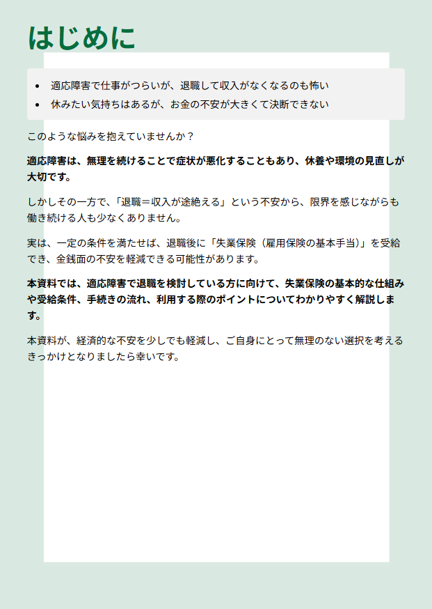 本資料では、適応障害のある人が知っておきたい失業保険の仕組みや活用方法についてわかりやすく解説しています。