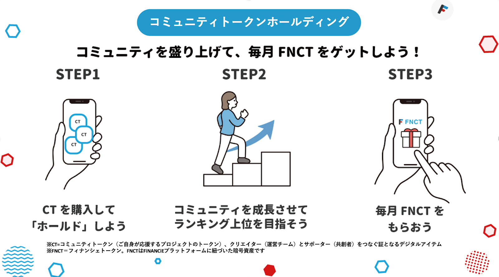 また、「コミュニティトークンホールディング(※3)」にもご参加頂くことで、サポーターの皆様自身にもFNCTが配布される可能性がありますので、是非この機会に併せてご参加ください。