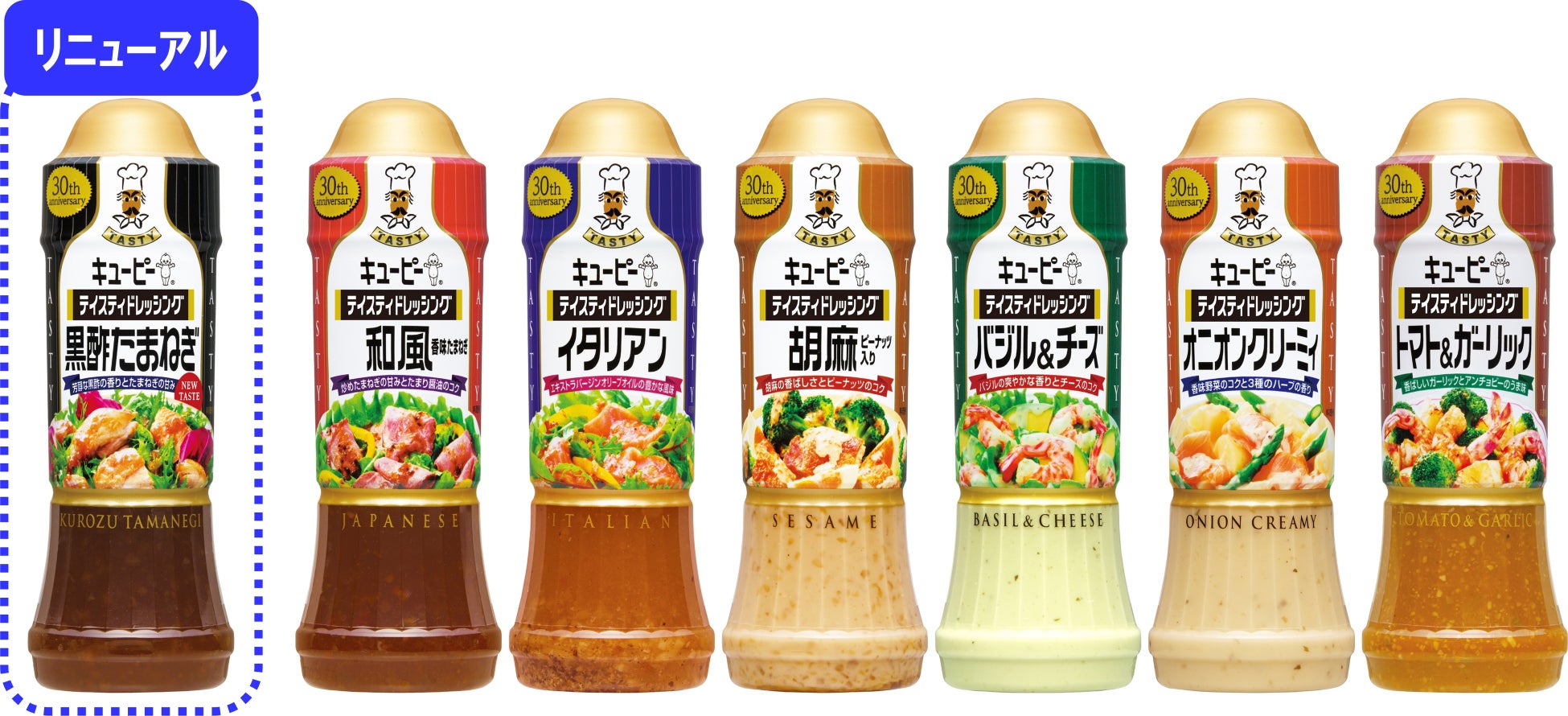 発売30周年のキユーピー「テイスティドレッシング」シリーズで主力商品「黒酢たまねぎ」をリニューアル!同時にシリーズ全7品のデザインを刷新