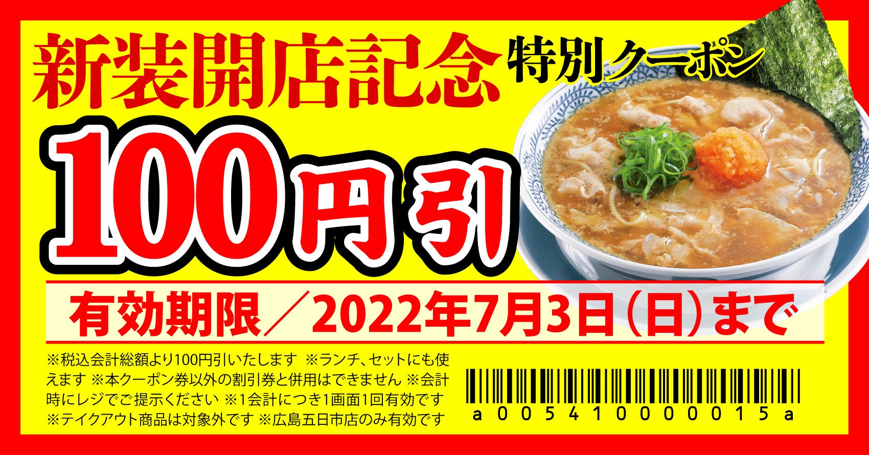オープン記念として、2022年7月3日(日)まで『丸源ラーメン 広島五日市店』のみでご利⽤いただける100円引クーポンを配布します。