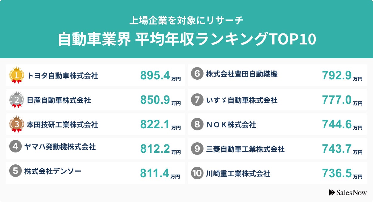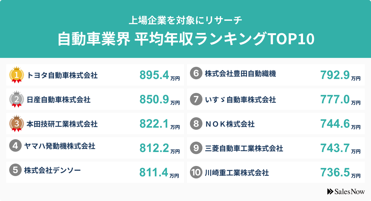 自動車業界、平均年収ランキングTOP10を発表!/SalesNow DBレポート