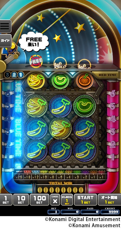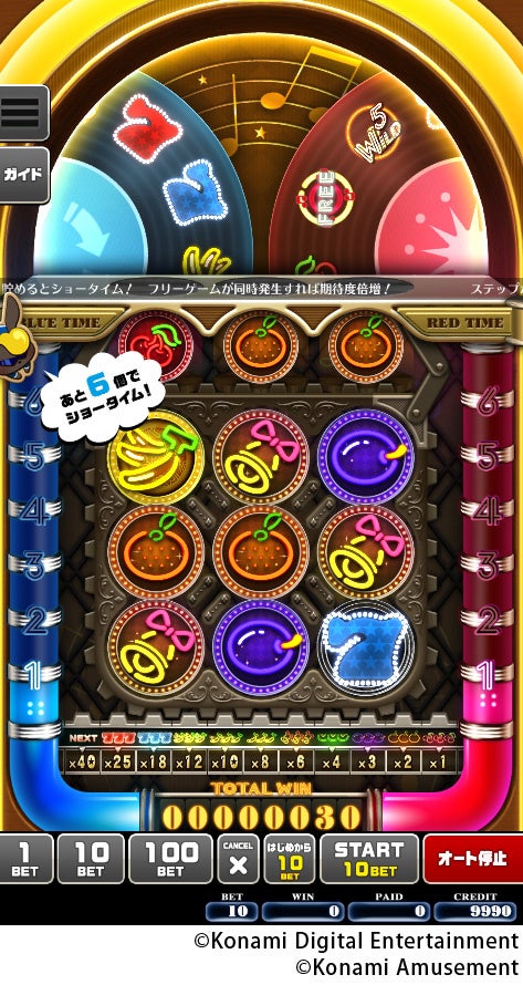「フィーチャープレミアム TwinkleDrop JUKE!」はジュークボックスをモチーフとした、1BETで全てのラインが有効になる新感覚ビデオシングルゲームです。フリーゲームに突入しやすくなる「ブルータイム」とシンボルが揃いやすくなる「レッドタイム」の2つのチャンスタイムが見どころとなっており、この2つが同時に発生すると、相乗効果でメダルの大量獲得が期待できます。