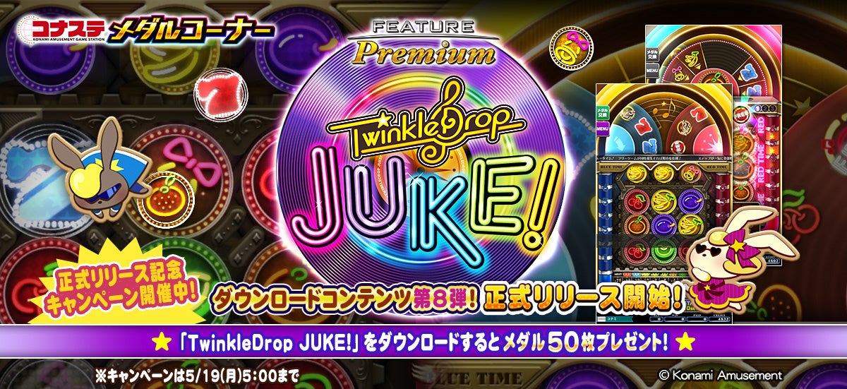 株式会社コナミアミューズメントは、『コナステ メダルコーナー』アプリ内のダウンロードコンテンツとして「フィーチャープレミアム TwinkleDrop JUKE!(トゥインクルドロップ ジューク)」を追加したことをお知らせします。
