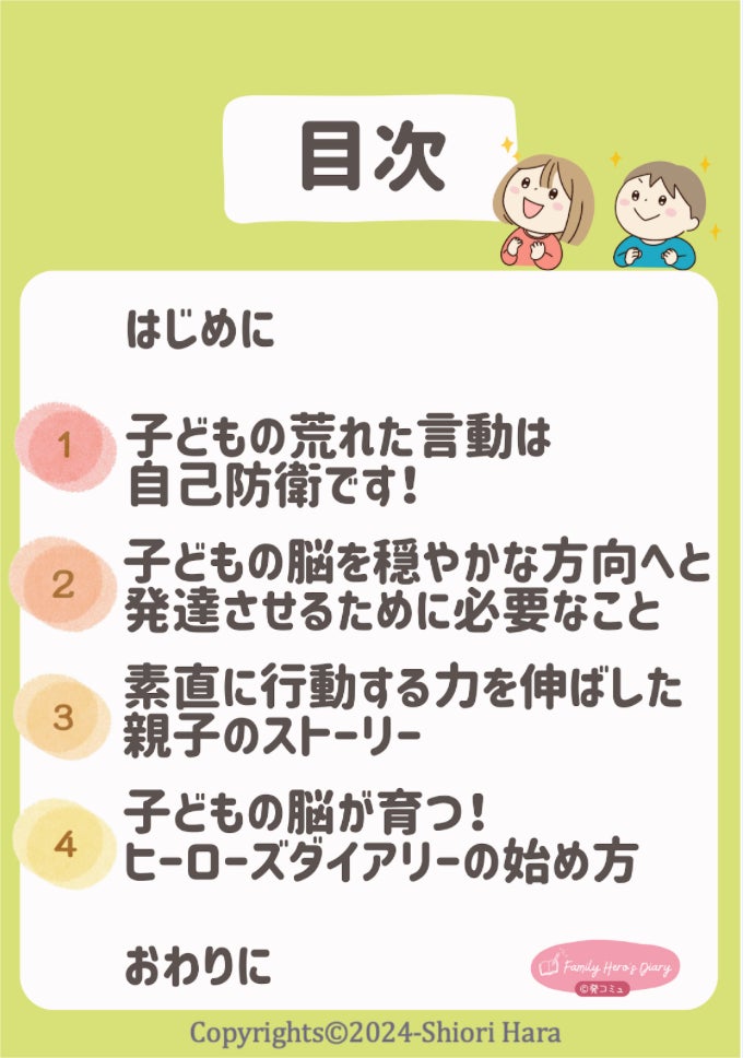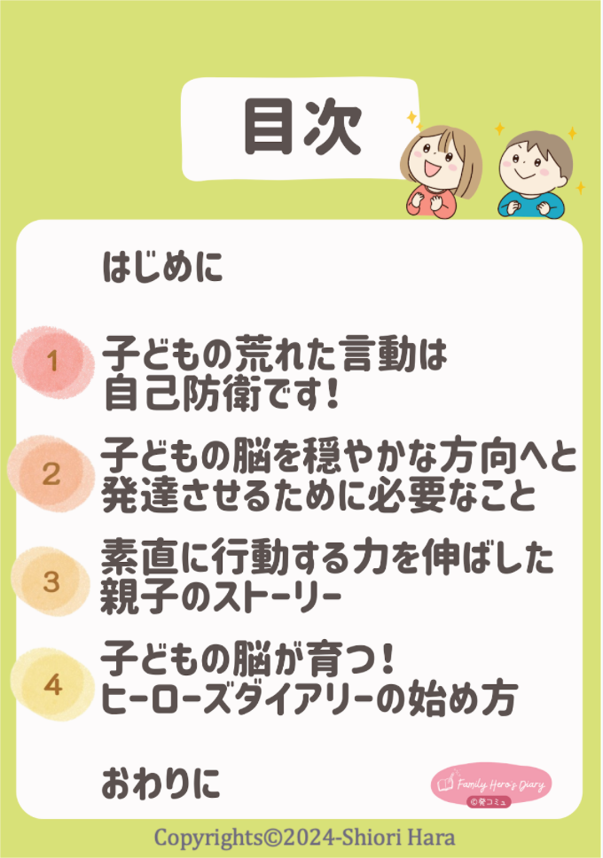 そこで私は、15年以上に及ぶ幼稚園・保育園の現場に教員・保育士として携わってきた経験と、子育ての体験から研究を重ね、子どもの脳の発達に直結する「ママの声かけ」と「親子でツクル育児日記」を日々のコミュニケーションにプラスして取り入れることで、子どもが自分の行動に対する自信を得られる!=自己効力感・自己受容感が育つ!ということを発見し、電子書籍にまとめました。今回の電子書籍では、普段の生活の中でお母さんが無理なく取り入れられる、ママの声かけやお子さんとの日記術をお伝えしています。