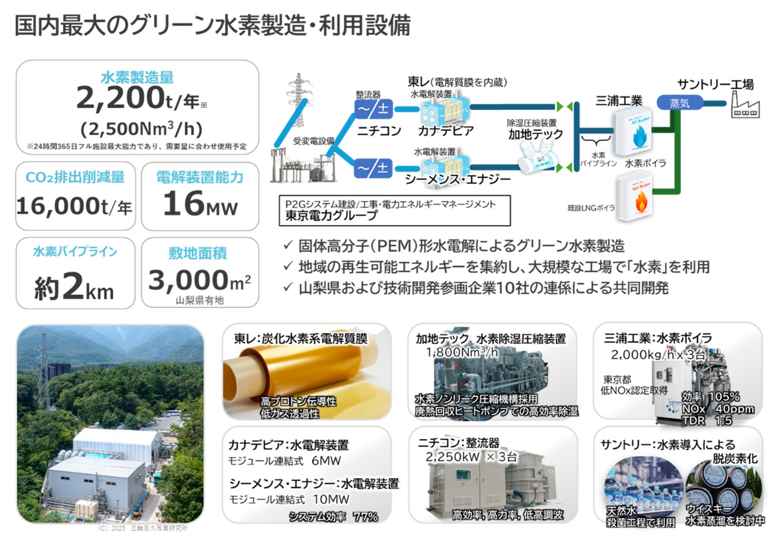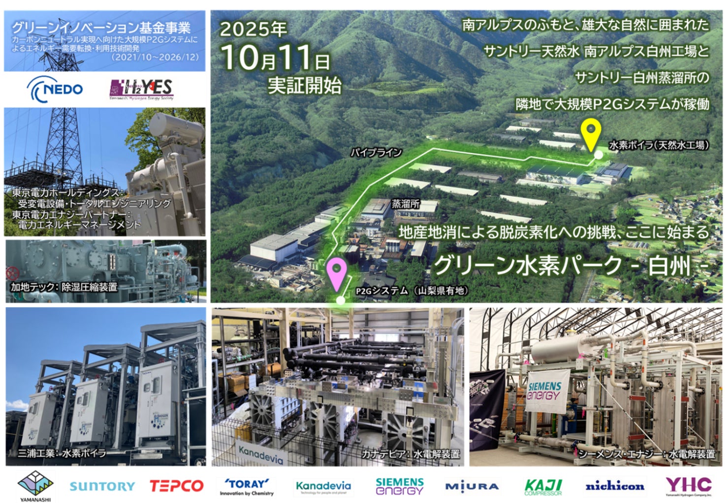 山梨県(知事:長崎幸太郎)は、技術開発参画企業10社※1とともに、サントリー天然水 南アルプス白州工場(以下、天然水工場)およびサントリー白州蒸溜所(山梨県北杜市)の脱炭素化に向け建設を進めてきた「やまなしモデルP2Gシステム」※2の実証施設(山梨県北杜市)について、令和7年10月11日(土)より稼働を開始しました。また、同日本実証施設から天然水工場へのグリーン水素の供給をスタートしました。