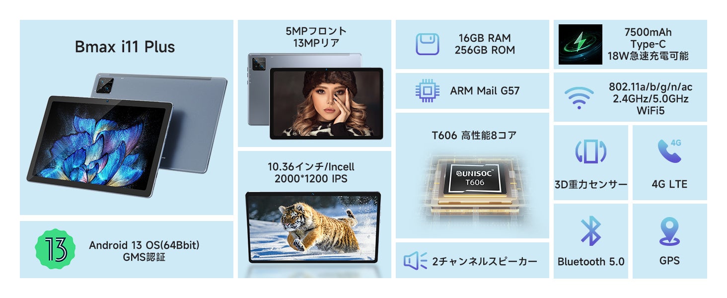 Bmax i11 Plus タブレット android13はT606高性能8コア1.6Ghz CPUが搭載なので、低消費電力と低発熱を実現でき、様々な機能が強化されており、より軽快な動作と高速な処理が可能になります。タブレット 本体は16GB RAMと256GB ROMの高速ストレージを搭載し、アプリを素早く起動させます。更にandroidタブレットは1TBまでメモリーの拡張ができ、容量を気にせずGoogle Playで 人気なアプリに対応でき、ビデオ、音楽、電子書籍、オンライン授業、ネットサーフィン、ゲームなど様々なエンターテイメントもこの一台で十分で、子供にも適当贈り物/キッズタブレットです。