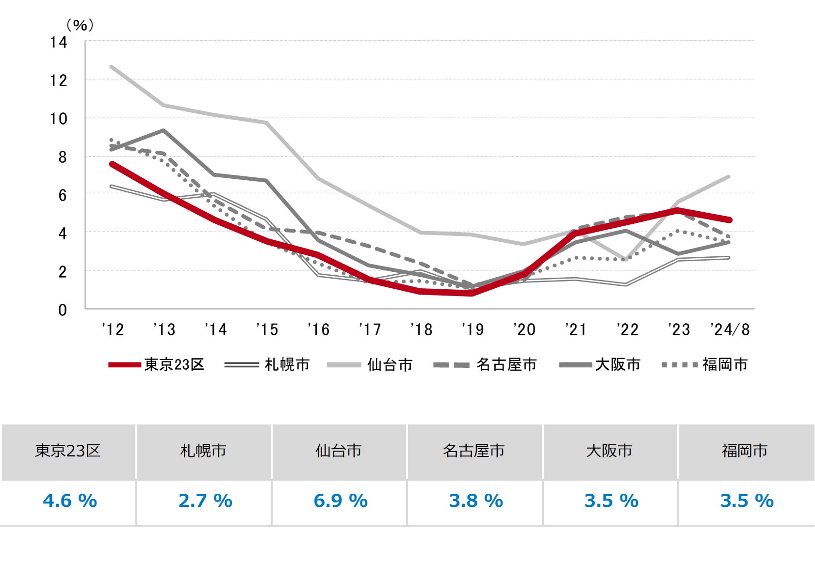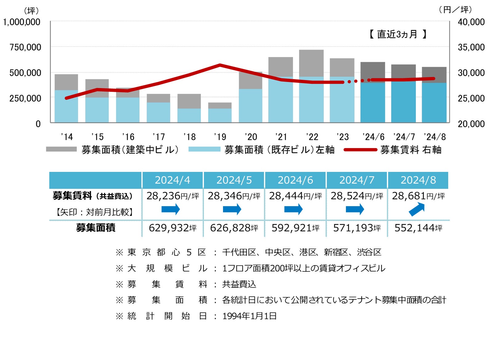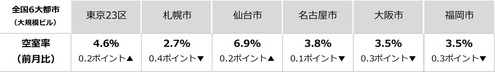 三幸エステート株式会社(本社:東京都中央区、取締役社長:武井重夫)は、2024年8月度の東京都心5区(千代田区、中央区、港区、新宿区、渋谷区)および全国6大都市(東京、札幌、仙台、名古屋、大阪、福岡)の大規模ビル※1のマーケットデータをまとめた「オフィスマーケット2024年9月号」を公表します。