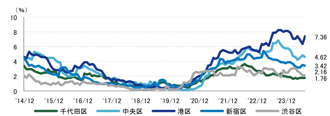 区別の空室率は、港区が前月から約1ポイントの大幅な上昇となり、3ヵ月ぶりで7%台となった。港区以外は前月からほぼ横ばいの小幅な動きに止まっており、千代田区では1%台の低水準が8ヵ月連続となっている。