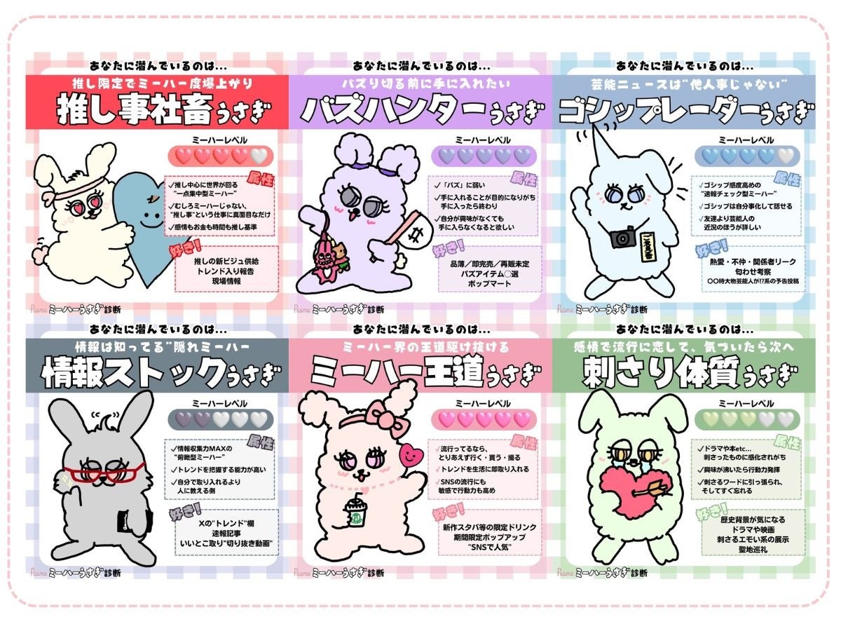 「fasmeミーハーうさぎ診断♡」の診断結果は全6タイプあり、あなたの“ミーハー気質”を可愛いうさぎのイラストとともに解説します。