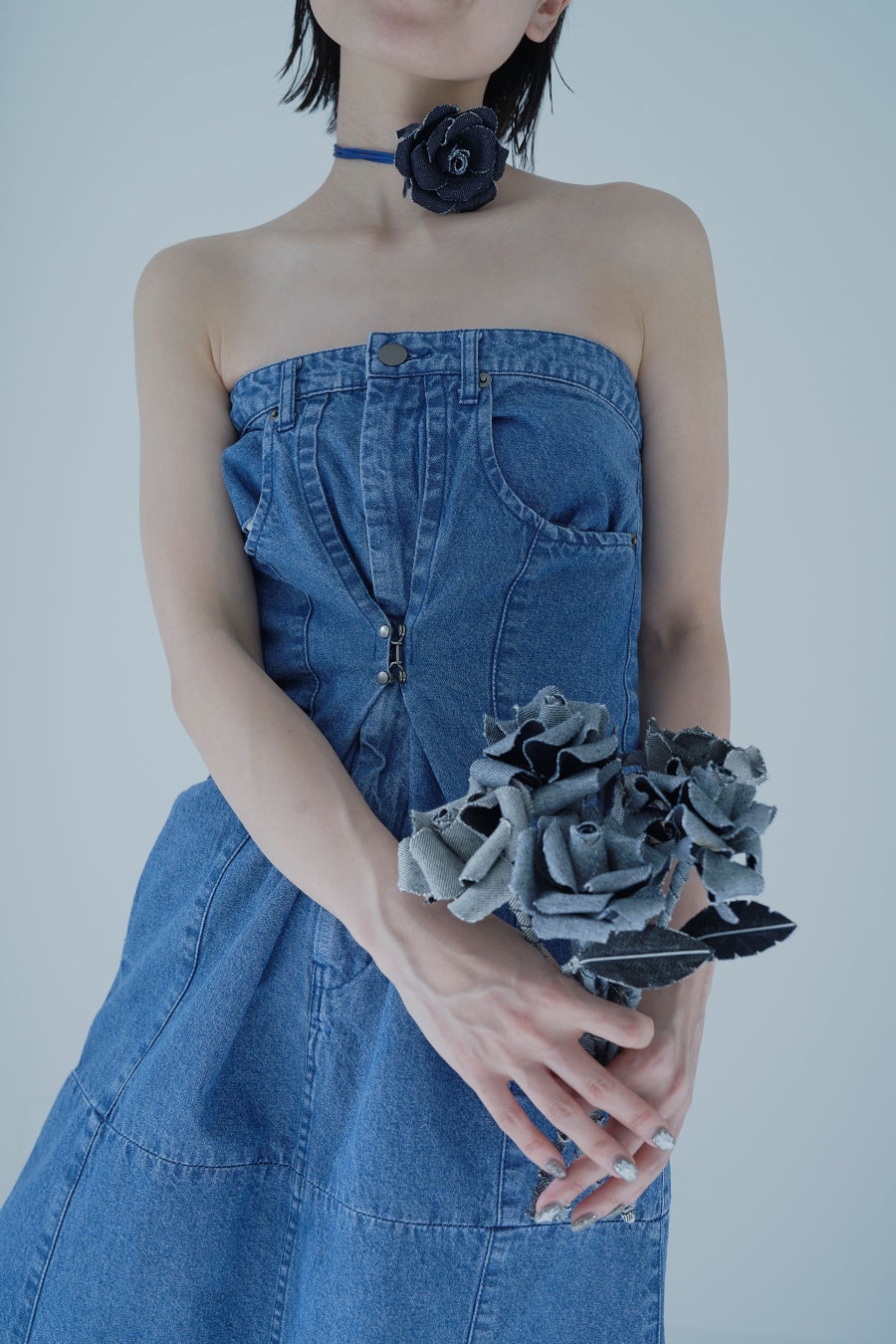 アーティシャルフラワーは、同日より販売開始となる【MADE IN JAPAN DENIM SERIES(メイド イン ジャパン シリーズ)】の生産過程で生じた廃生地の“ストックファブリック”を利用し製作しています。また、対象商品をお買い上げの方に、同様に製作されたフラワーコサージュをノベルティとしてプレゼントいたします。