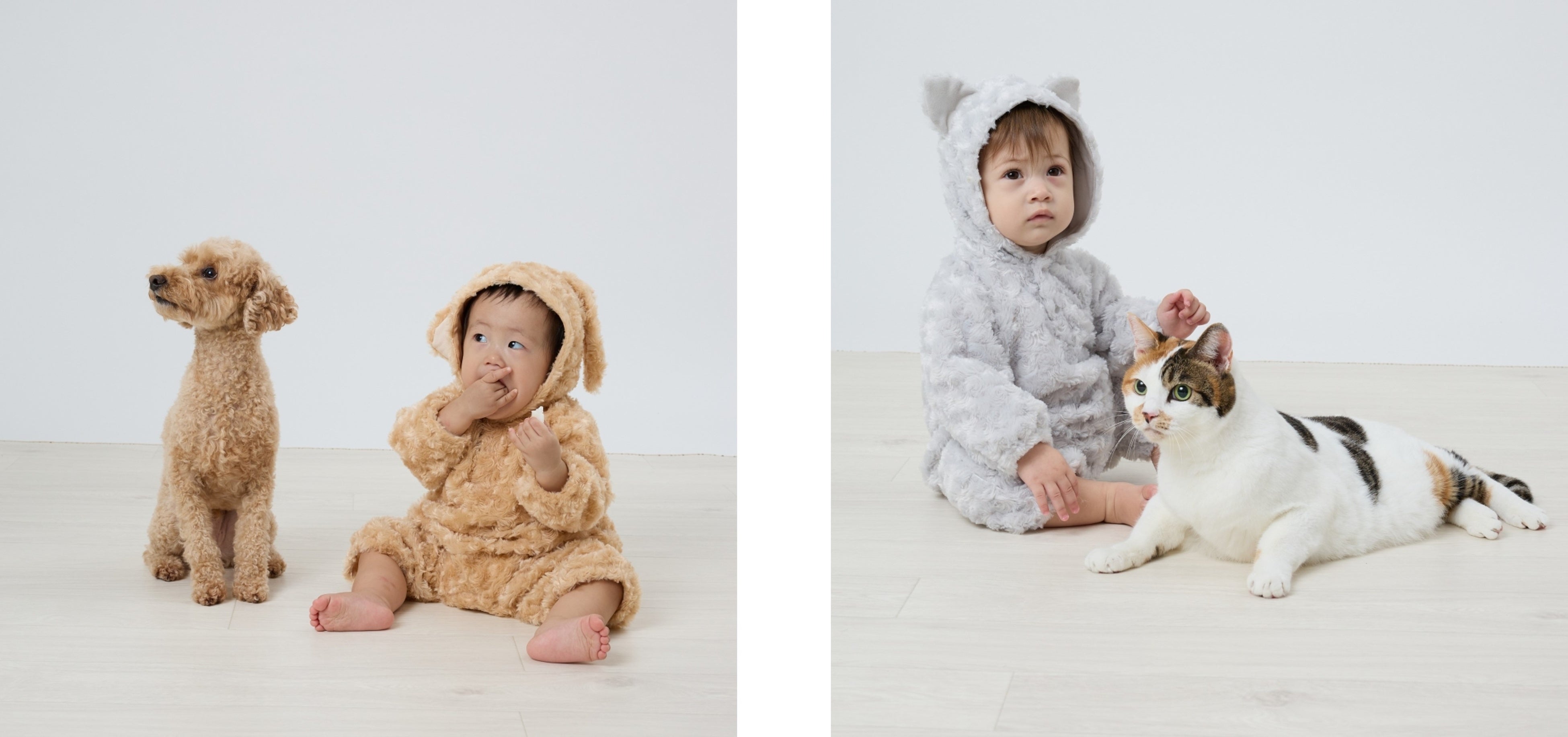 さらに、フードをかぶるともこもこのワンちゃん・ネコちゃんになりきれちゃう、うずまきフリースの耳付き長袖ロンパース2アイテムも11月1日(金)より順次発売いたします。暖かいシープボア素材を使用しており、冬のお出かけにもピッタリなアイテムです。