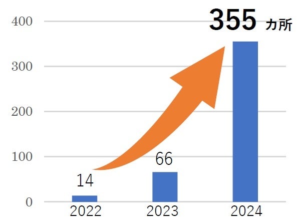 2022年のサービス開始当初、「WiFiBOX」の設置箇所は主要空港14カ所のみ。主に日本から海外への旅行やビジネスユーザーの利用のみでした。2024年からは訪日外国人および国内におけるビジネスや観光、外出時の大容量データ通信利用によるギガ不足などの国内での需要を見いだし、全国の空港およびJR、私鉄各社の主要ターミナル駅を中心に街中への設置を強化。さらに各沿線への増設、商業施設やレジャーバーク、ホテルへの設置など全国各地への設置を積極的に進めた結果、2024年には設置拠点355カ所(11月1日現在)と急拡大を遂げました。