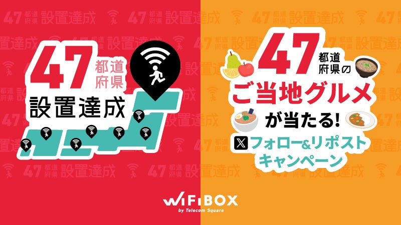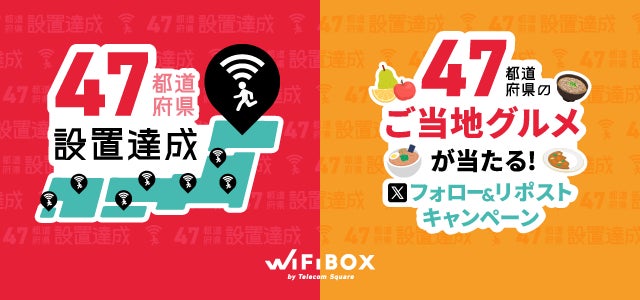 「WiFiBOX」の全都道府県への設置達成を記念し、「47都道府県のご当地グルメが当たるXフォロー&リポストキャンペーン」を11月1日~11月15日の期間限定で開催します。ぜひご参加ください。