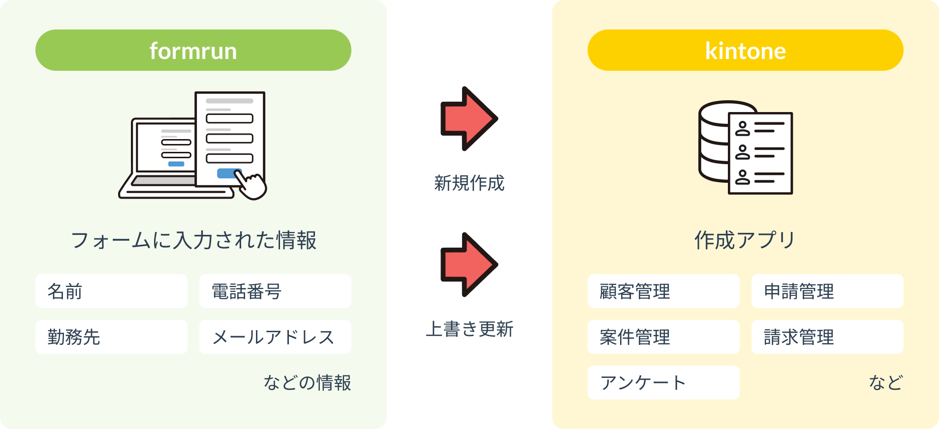 『formrun』と『kintone』との連携機能は、『formrun』に入力された情報を『kintone』のアプリに自動送信・リアルタイム連携することで、顧客情報の管理の手間やコストを大幅に削減できる機能です。