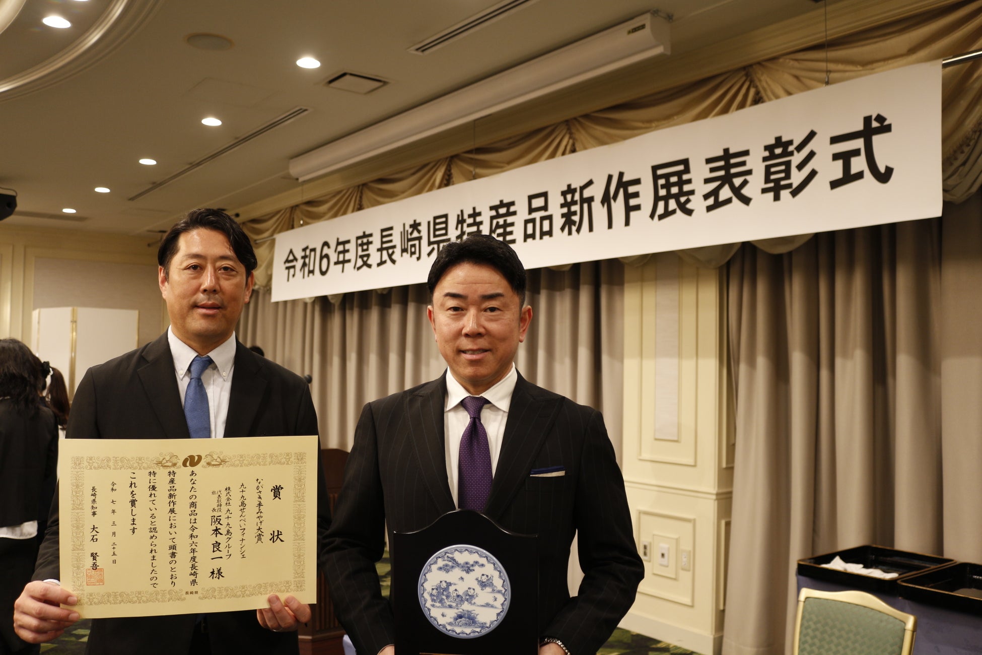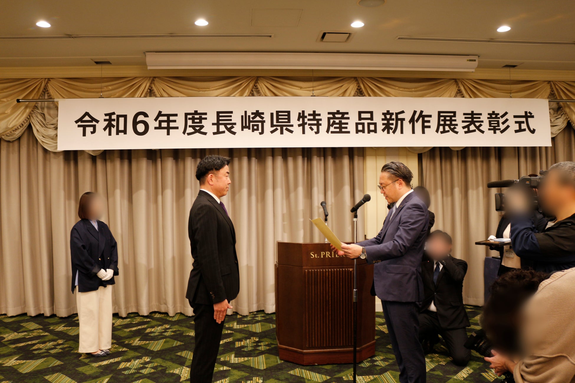 以下は、3月25日(火)に行われた表彰式での様子です。多くの皆さまからお祝いのお言葉を頂き、改めて受賞の喜びと長崎銘菓として今後も愛される商品づくりに励むべく、身の引き締まる想いを感じております。
