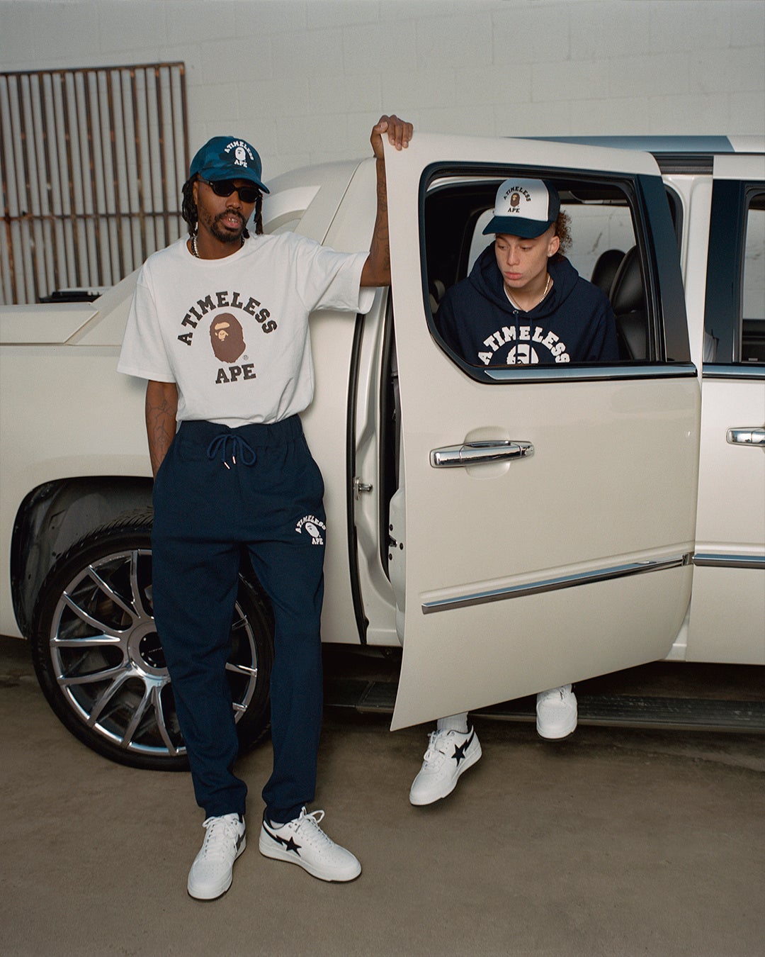 象徴的なのは、BAPE®のシグネチャーの一つでもある、BAPE STA™をミニマルにアレンジし、前回に引き続きカレッジロゴに変化を加えることで本コラボレーションならではのオリジナリティあふれるデザインに仕上がっています。