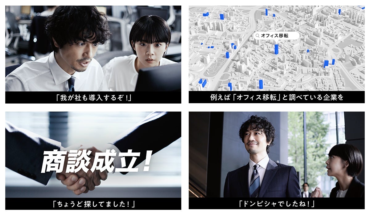 その後、「インテントセールスなら、例えば今『オフィス移転』と調べている企業を狙い撃ちできる」などの解説ナレーションとともに、2人がインテントセールスを正しく認識し『Sales Marker』を活用したことで、スマートに商談成立へとつなげる様子がコミカルに展開されます。