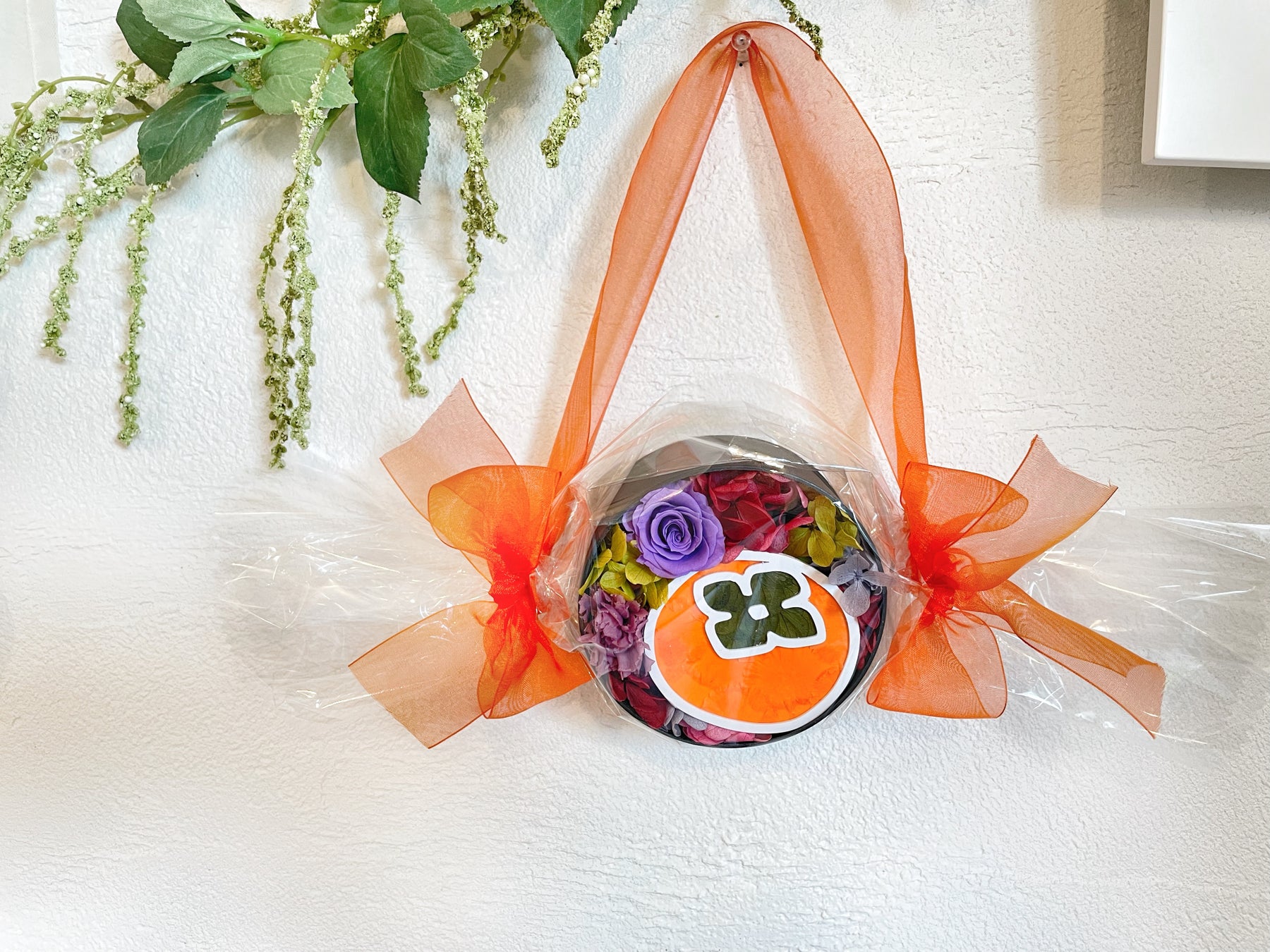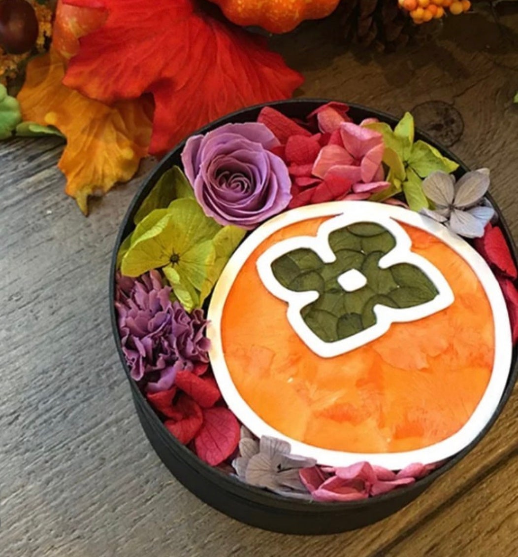 被らない敬老の日ギフトに!秋の風物詩を目と舌で愉しむ、ハートの形をした柿のドライフルーツと、花で柿を描いたアートなフラワーBOXのギフトセットが登場。