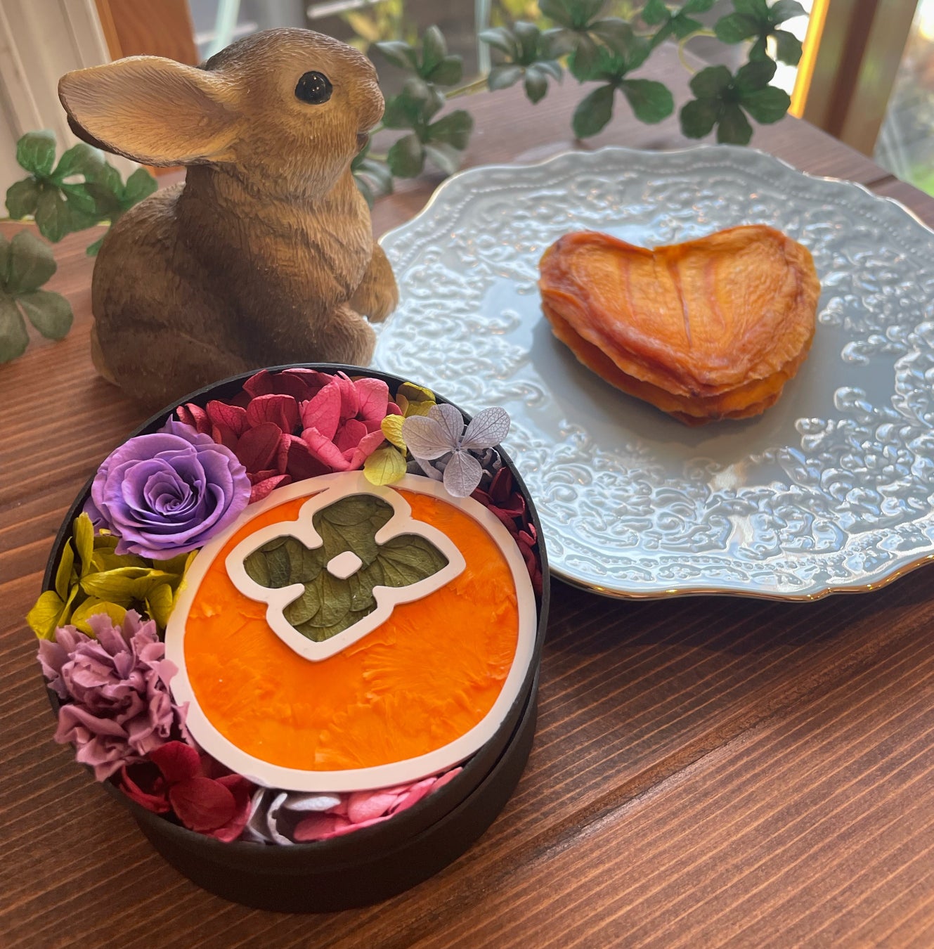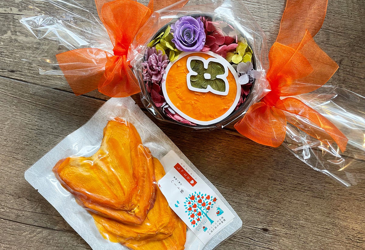 “秋の実り”を代表する果物である柿をテーマに、愛媛県愛南町の特産品を販売する「うさぎ堂」とコラボ。ハートの形をした柿のドライフルーツ「ハート柿」と、お花で柿を描いたユニークなフラワーBOXのセット。