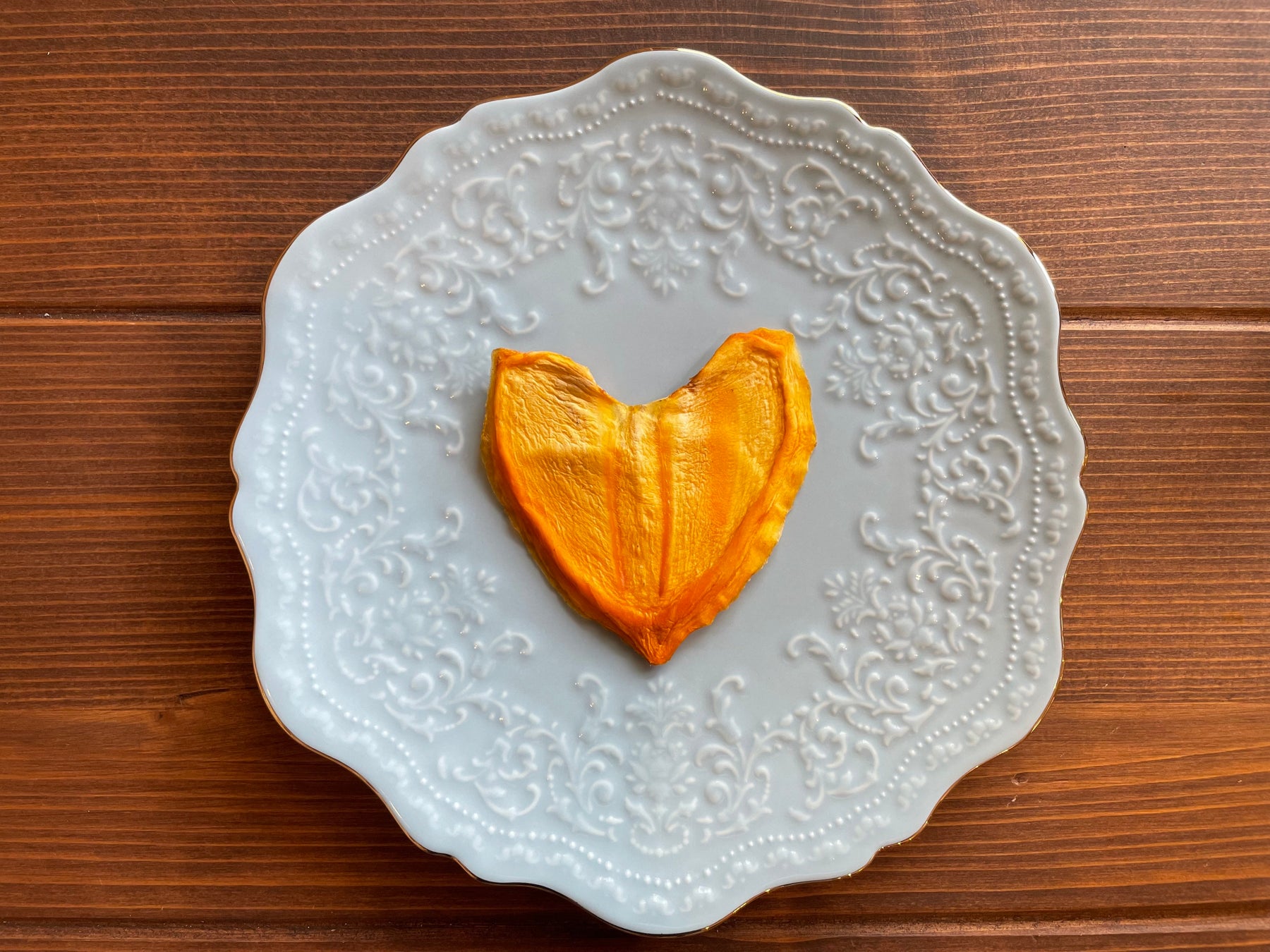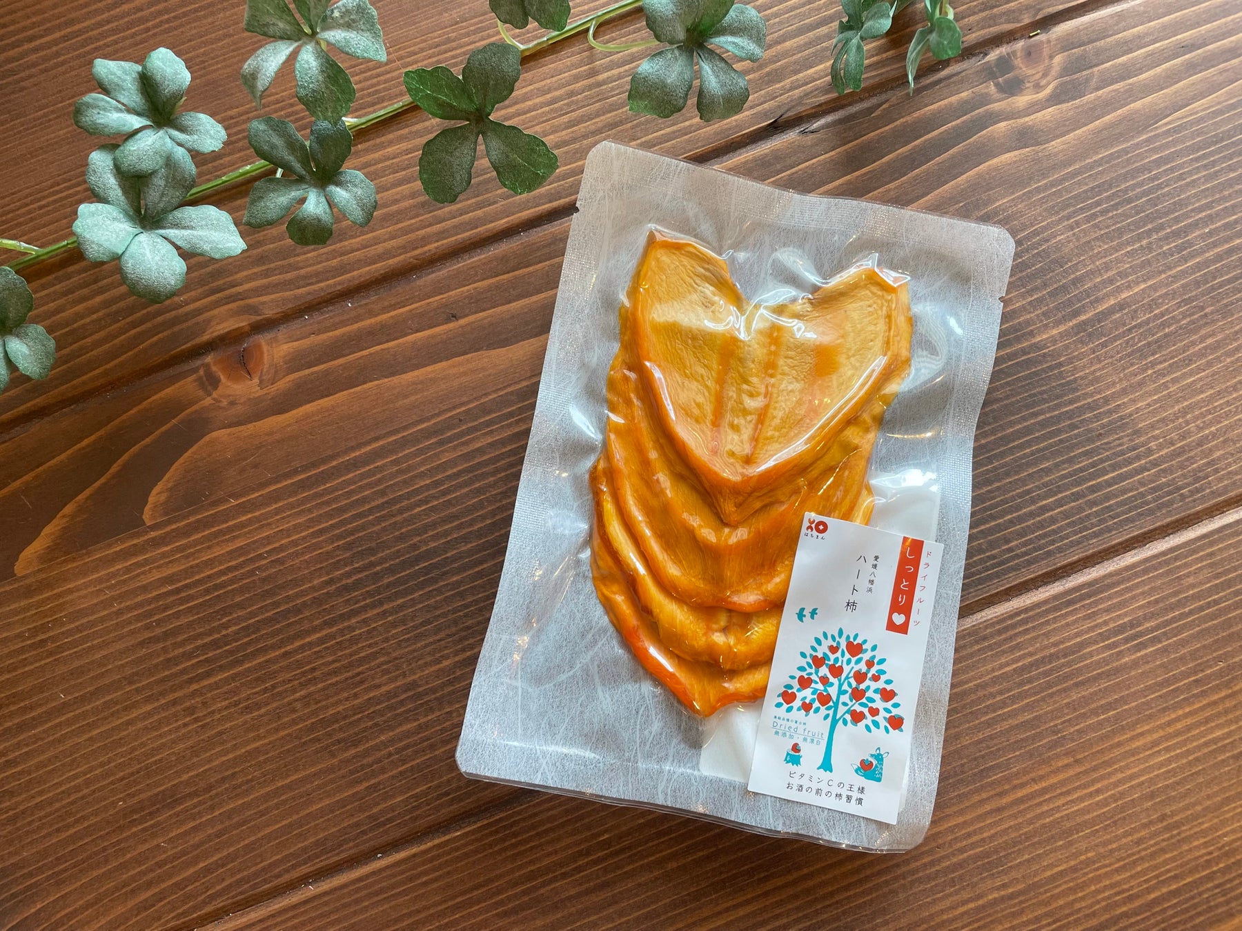 「ハート柿」は、愛媛県・南予地方の八幡浜産の富士柿を使用した「うさぎ堂」自慢のドライフルーツ。自然にスライスすると可愛いハート型になることから「ハート柿」と名付けられました。
