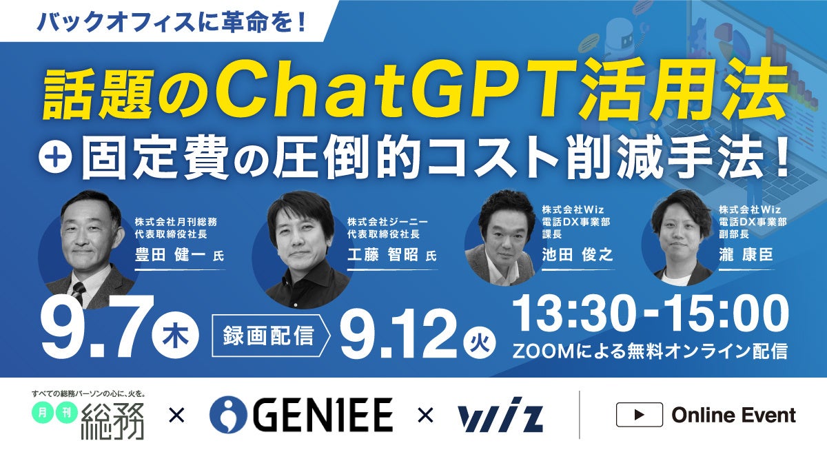 9月7日(木)、9月12日(火)※、株式会社Wiz(本社:東京都豊島区、代表取締役社長:山崎 俊)は、【株式会社月刊総務 代表取締役社長 豊田 健一氏】【株式会社ジーニー 代表取締役社長 工藤 智昭氏】をゲストに迎え、AIを活用したバックオフィスの圧倒的な業務効率化・コスト削減の手法をお伝えするウェビナーを開催いたします。