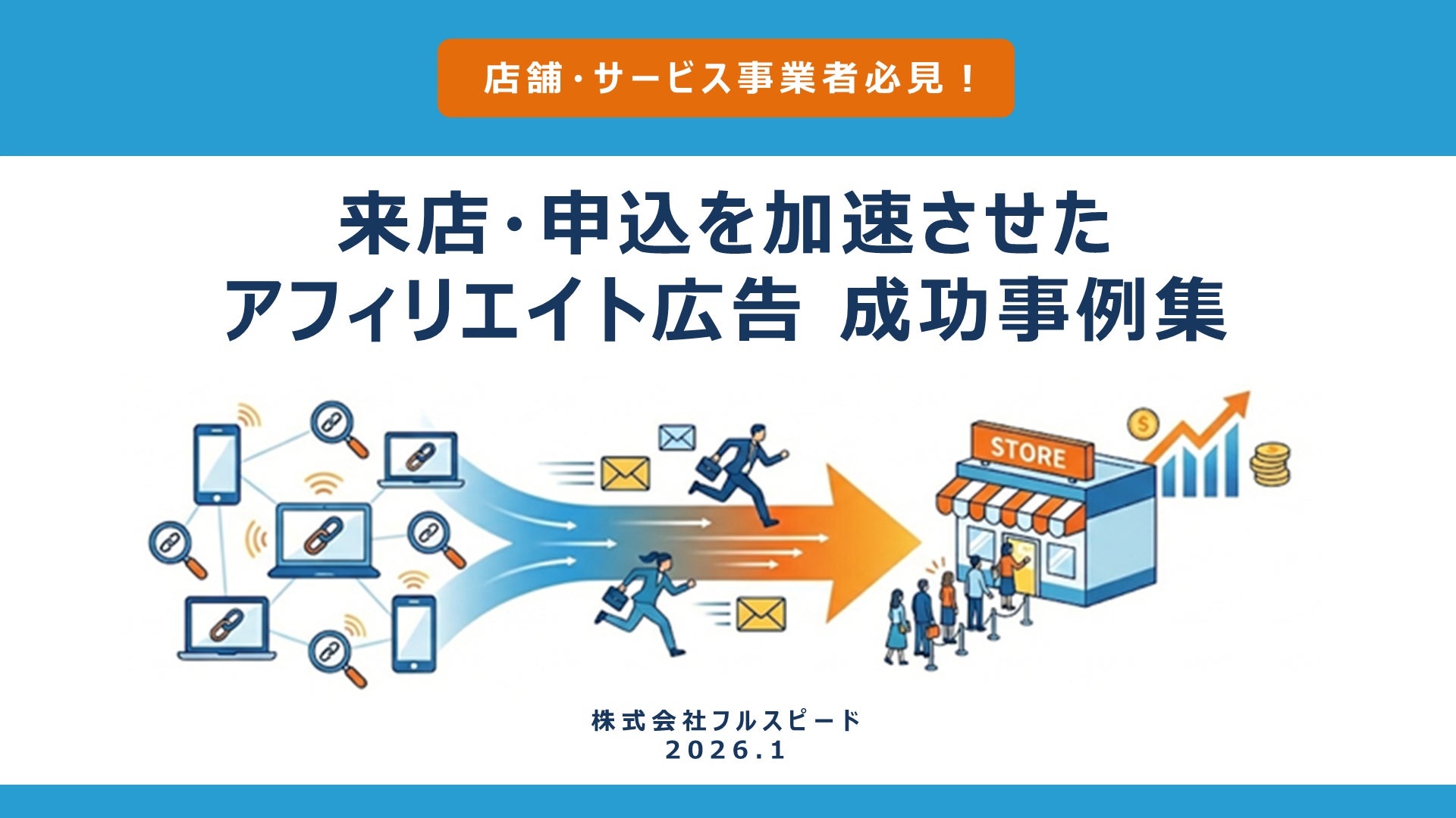 アフィリエイト広告運用による広告効果の最大化を支援する株式会社フルスピード(本社:東京都渋谷区、代表取締役社長:吉澤竹晴)は、アフィリエイト広告を活用した来店・申込獲得に焦点を当てた事例集 「店舗・サービス事業者必見! 来店・申込を加速させたアフィリエイト広告成功事例集」 を公開しました。