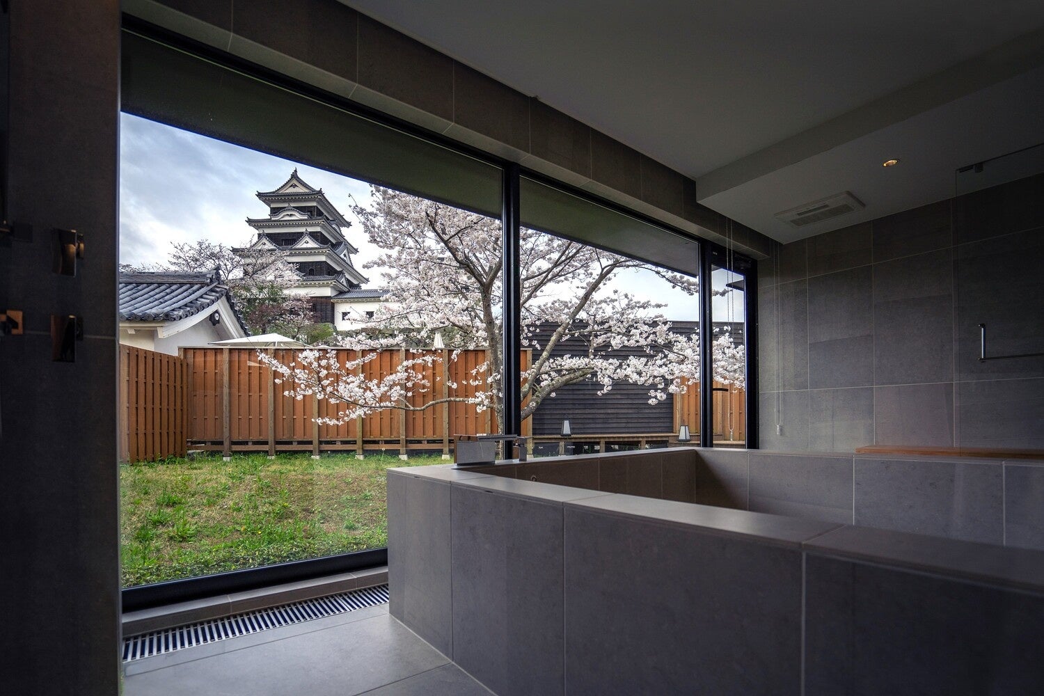 「お湯殿」は大洲城へ向かう坂の途中にあるプライベートバス・ラウンジです。庭に咲き誇る立派な桜越しには、そびえたつ大洲城を望むことができます。1日1組限定の特等席で、贅沢なバスタイムをお愉しみください。湯上りにはラウンジスペースでご自由にドリンクをお召し上がりいただけます。
