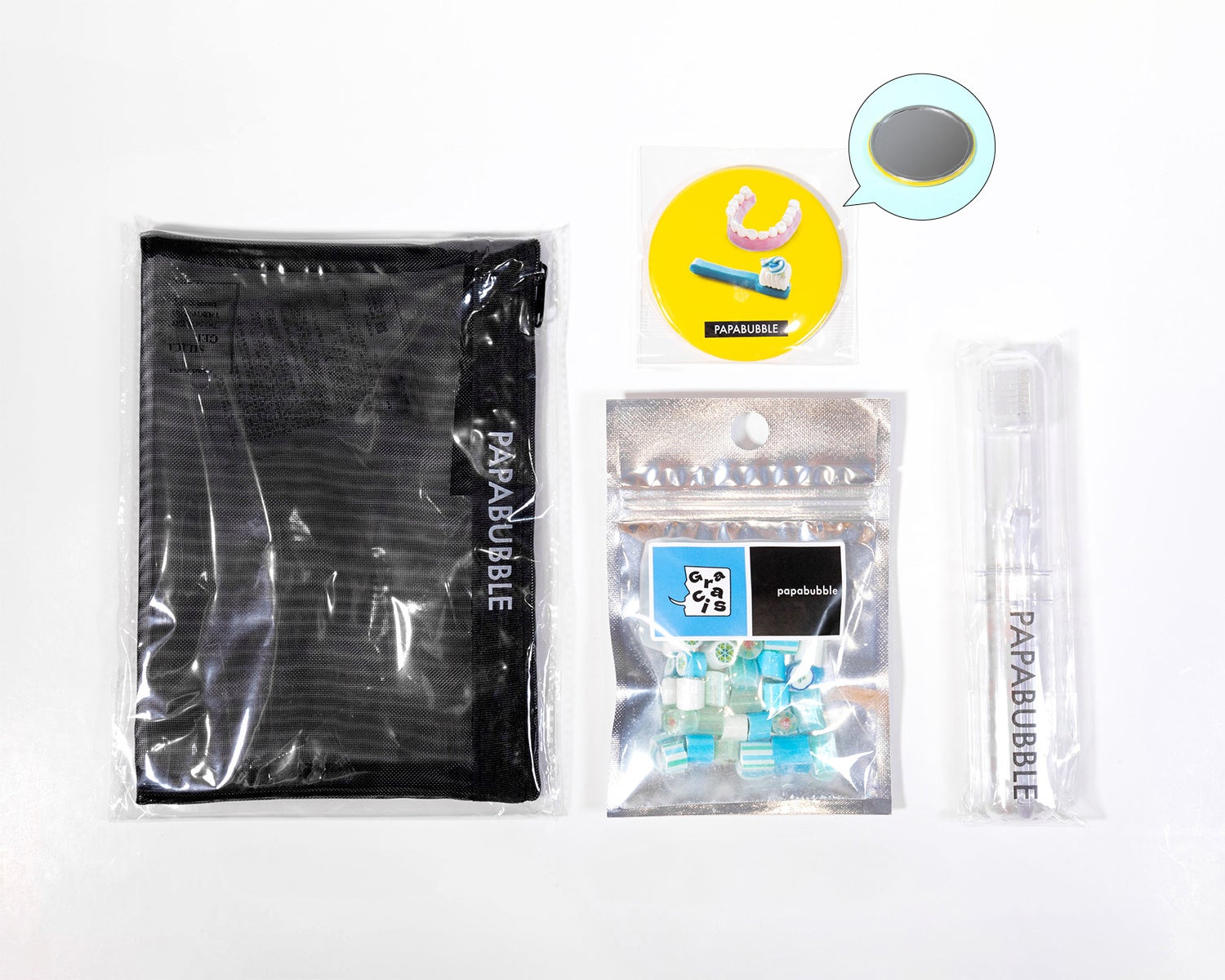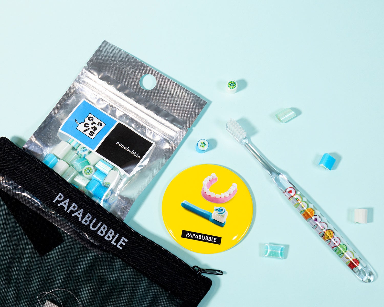 「キャンディを食べたら、歯磨きをしよう!」をテーマにしたギフトセットが新登場。歯ブラシ、缶ミラー、ホワイトデー限定キャンディ、PAPABUBBLEのロゴ入りポーチの4点セットです。歯ブラシには人気のフルーツミックス、缶ミラーにはキャンディでできた歯ブラシと入れ歯がデザインされたオリジナルデザインが施されています。ちょっとユニークなホワイトデーのお返しをお探しの方にオススメ。ポーチはトラベルにも普段使いにも便利なサイズで、実用性も抜群です。