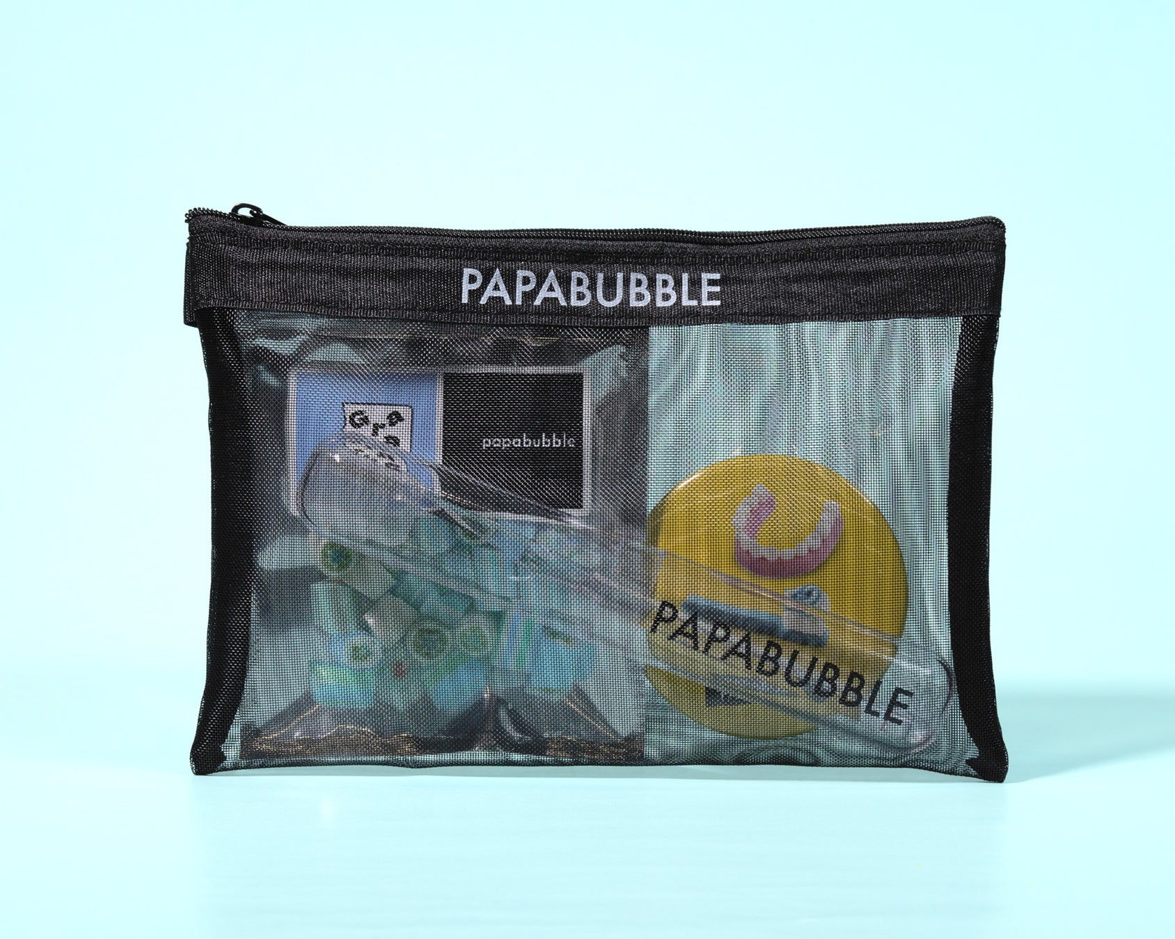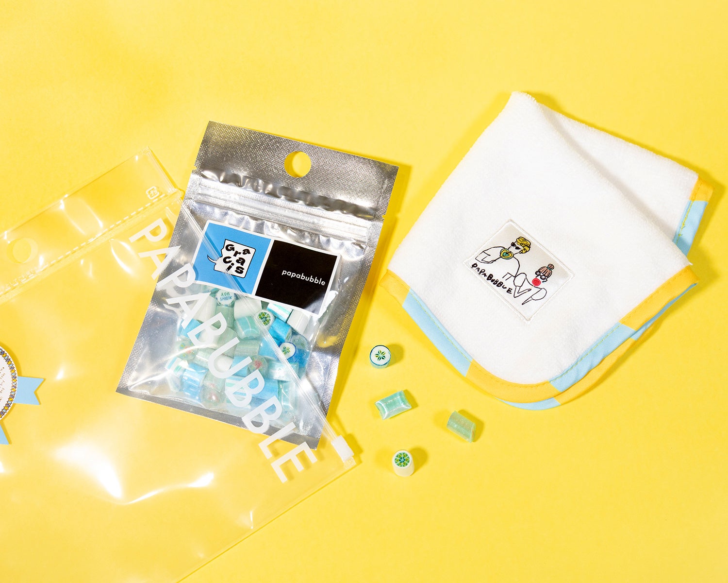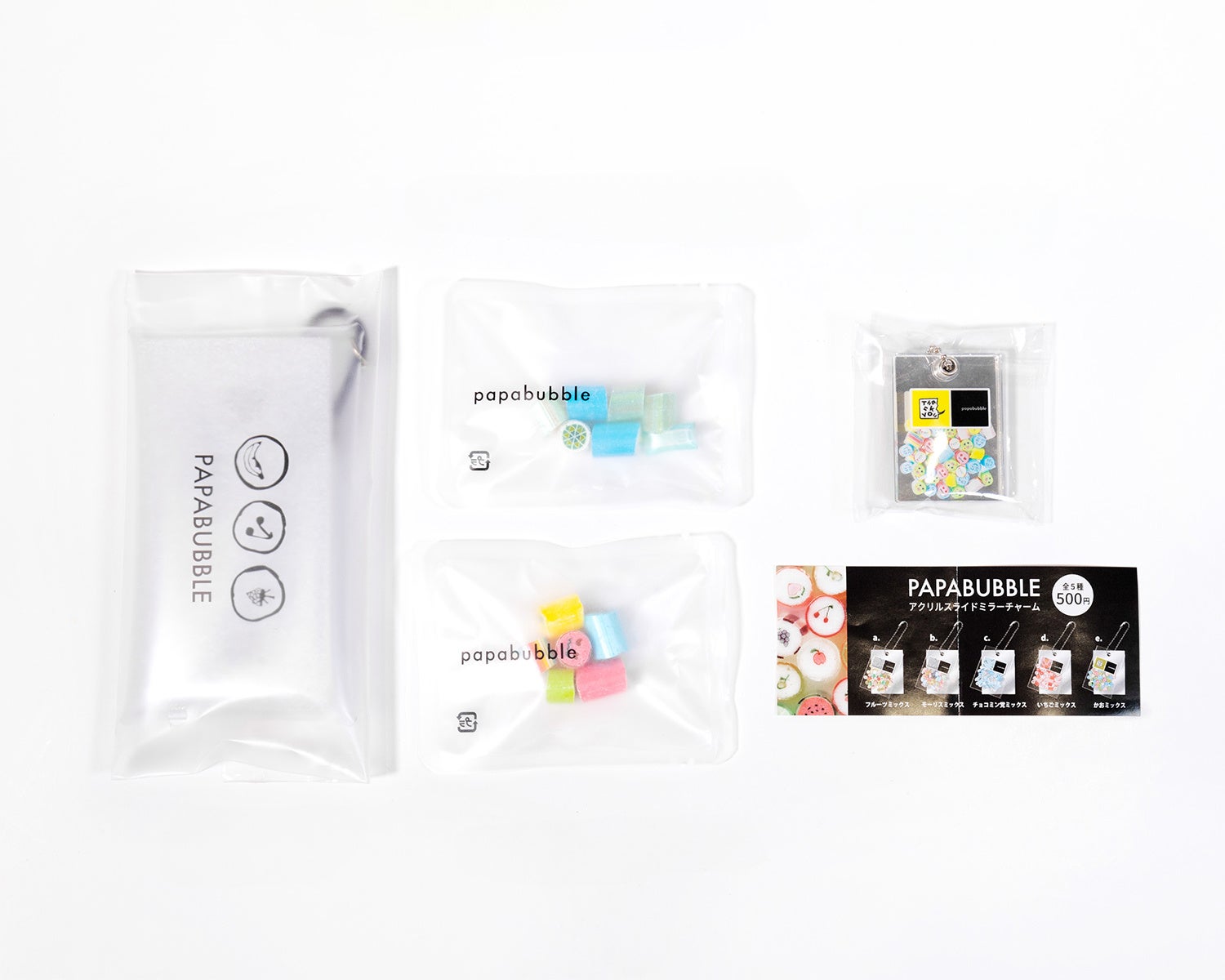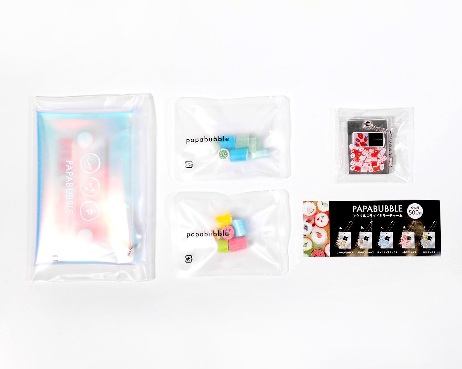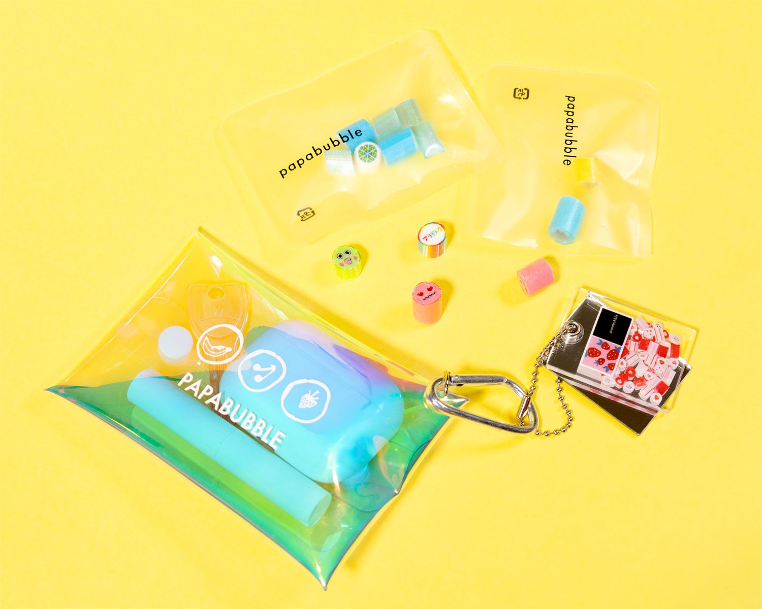 カラビナ付きのクリアポーチと、パパブブレの人気商品のパッケージデザインが施されたミラーチャーム、そしてキャンディが入ったギフトが新登場しました。パパブブレのロゴやバナナ・チェリー・いちごのキャンディ柄があしらわれたポーチは、ちょっとした小物を入れるのにぴったりなサイズ。コンパクトながら実用性も抜群です。また、女性に人気のオーロラ素材を使用したポーチも登場。お好きなデザインをお選びいただけます。
