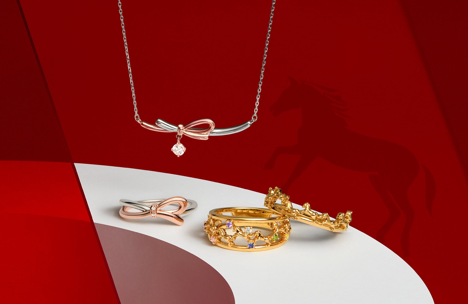 干支である「午(うま)」のモチーフは、その年を象徴する力強さや、前を向いて進む人へのエールを込めたアイコンとして、リングやネックレスの中で躍動しています。また、七福神に見立てた七色のストーンをあしらったシリーズでは、身に着ける人の想いにそっと重なる、願掛けのような存在に。2026年という新たな物語を、静かに美しく走り出すために、このジュエリーたちが、あなたのそばに寄り添い、やわらかい光で未来を照らしますように。