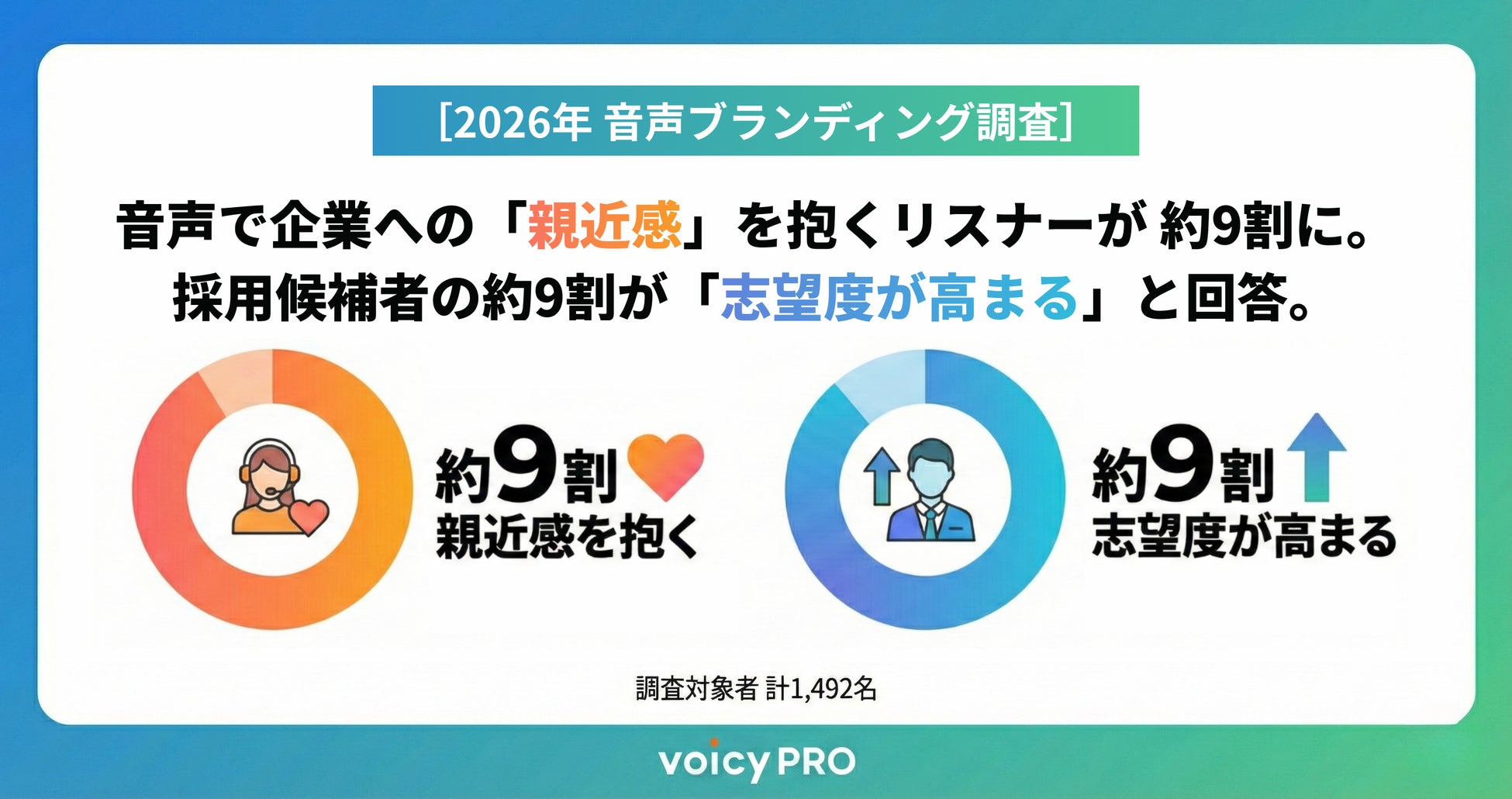 株式会社Voicyは、2026年2月2日から2月8日にかけて「企業の音声配信に関するアンケート」を実施いたしました。直近2週間以内に音声配信を聴取したリスナー 計1,492名を対象とした本調査の結果、音声配信は企業の透明性を高めるだけでなく、採用候補者の志望度をダイレクトに引き上げる強力なコンテンツとなる有効性が明らかになりました。