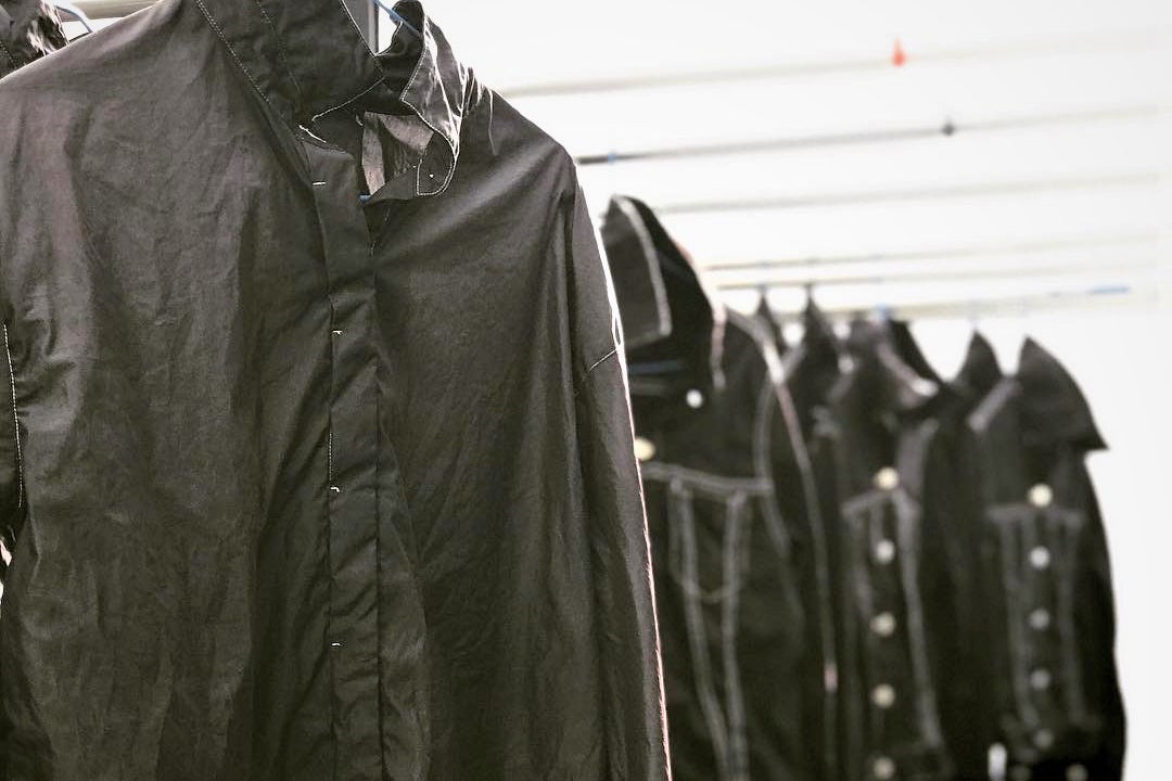 英国の老舗ブランド「アクアスキュータム」と、京都の老舗黒染め屋「京都紋付」が協業したアップサイクル商品を販売します。アクアスキュータムの規格外品を、京都紋付の黒染め技術によって染め替え、新たな価値を加えたアイテムです。