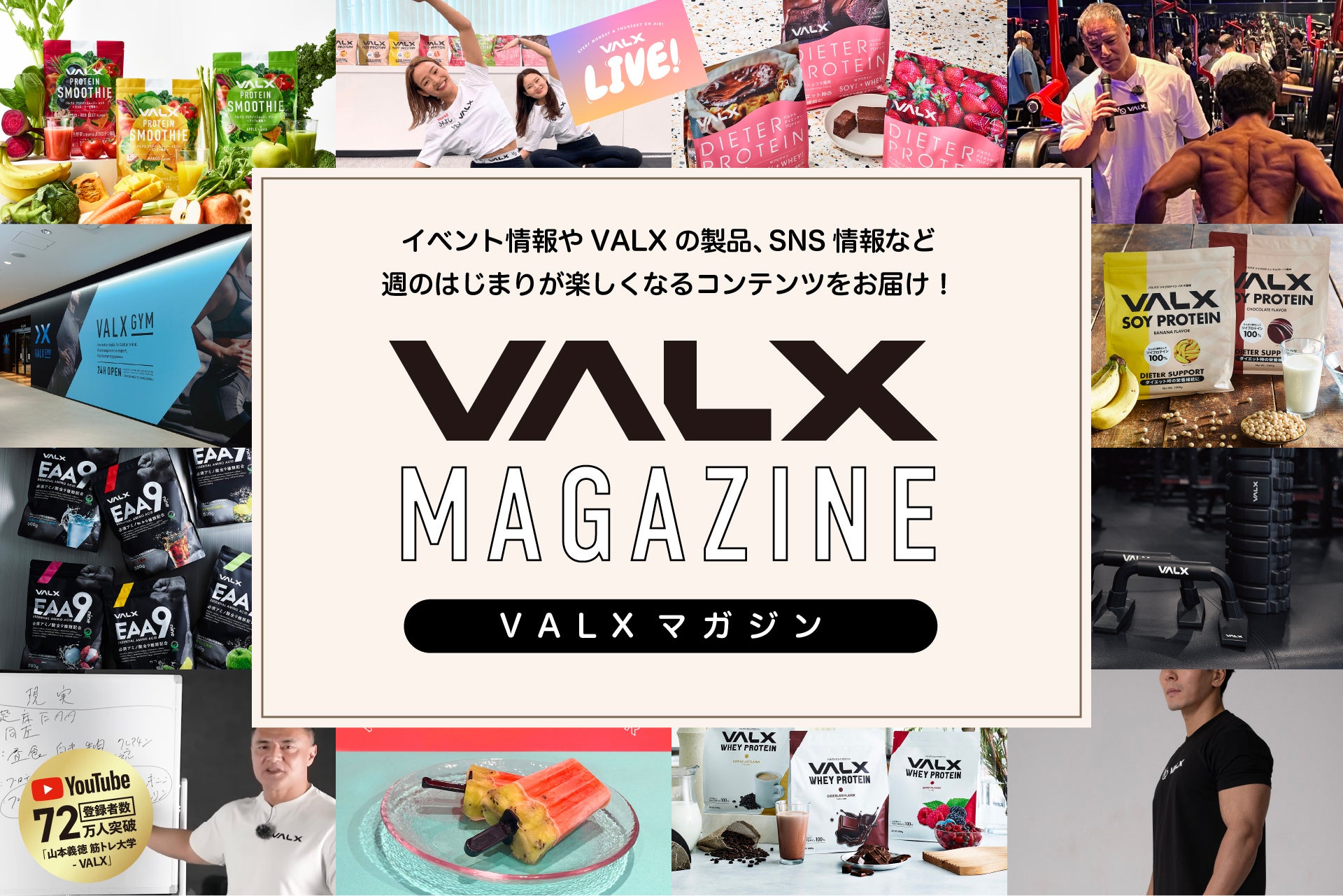 VALXのイベントやキャンペーン情報等の最新ニュースだけでなく、筋トレ界のレジェンド山本義徳氏が出演するYouTubeチャンネル「山本義徳 筋トレ大学 - VALX」や毎週月曜日と木曜日に配信している「VALX LIVE!」に関する情報等、盛りだくさんでお届けします。