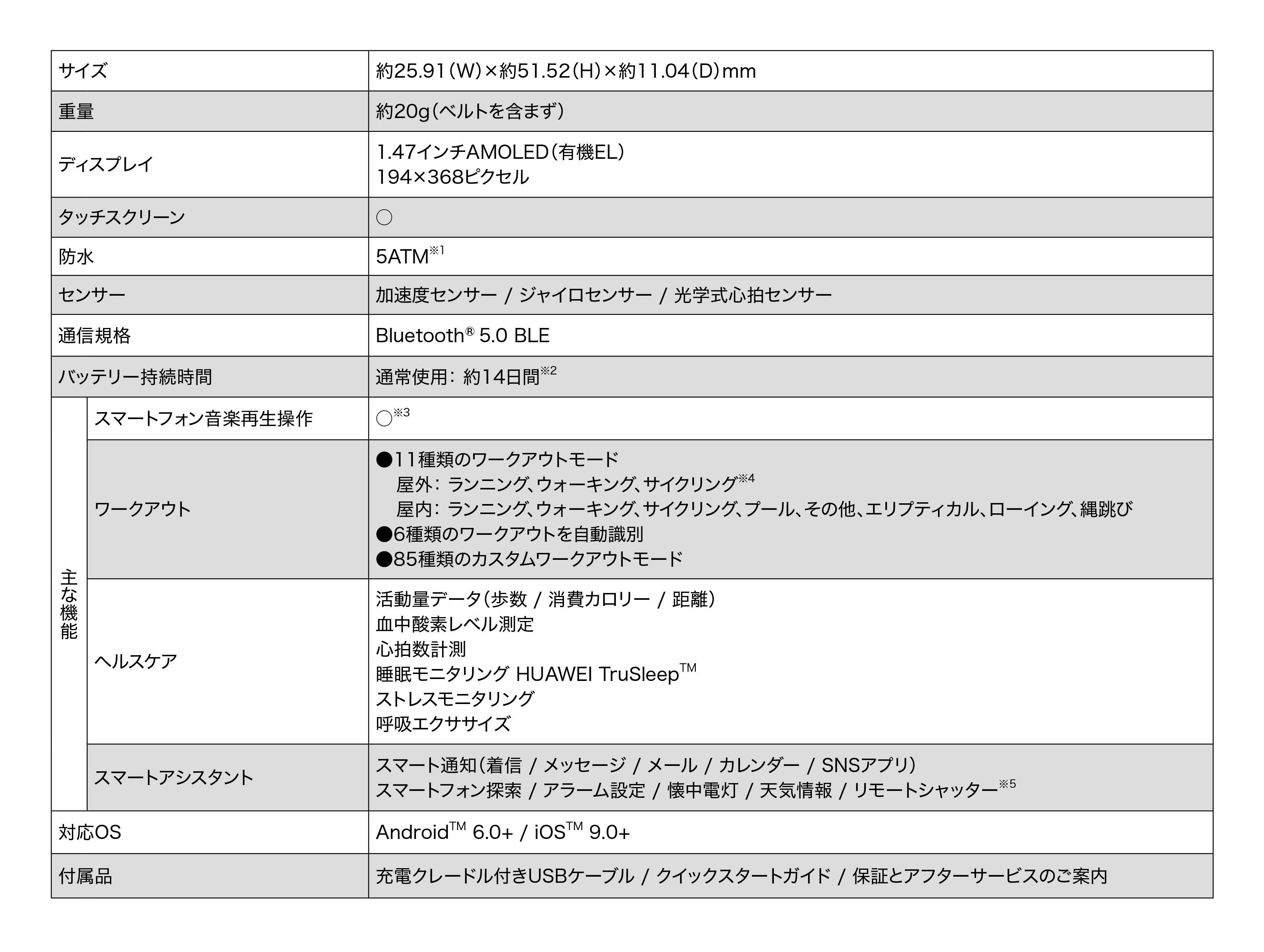 ※3:通常使用で約14日間は、24時間心拍数モニタリングON、睡眠モニタリングがON(HUAWEI TruSleep™ OFF)、メッセージ通知ON(1日平均50メッセージ、電話6回、アラーム3回)、1日に200回画面表示、毎週30分のワークアウトをした場合のファーウェイラボのテスト結果を参考にしています。