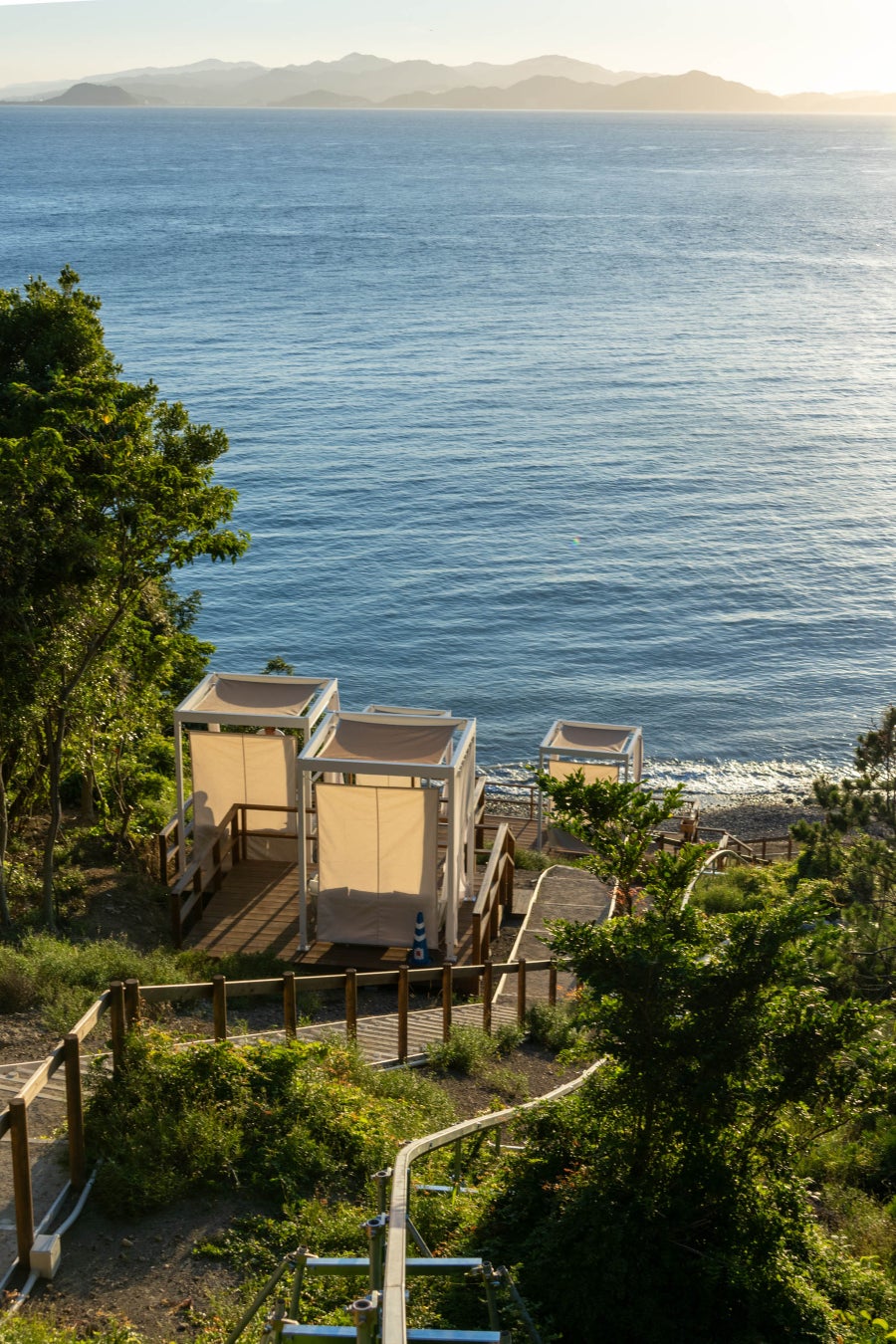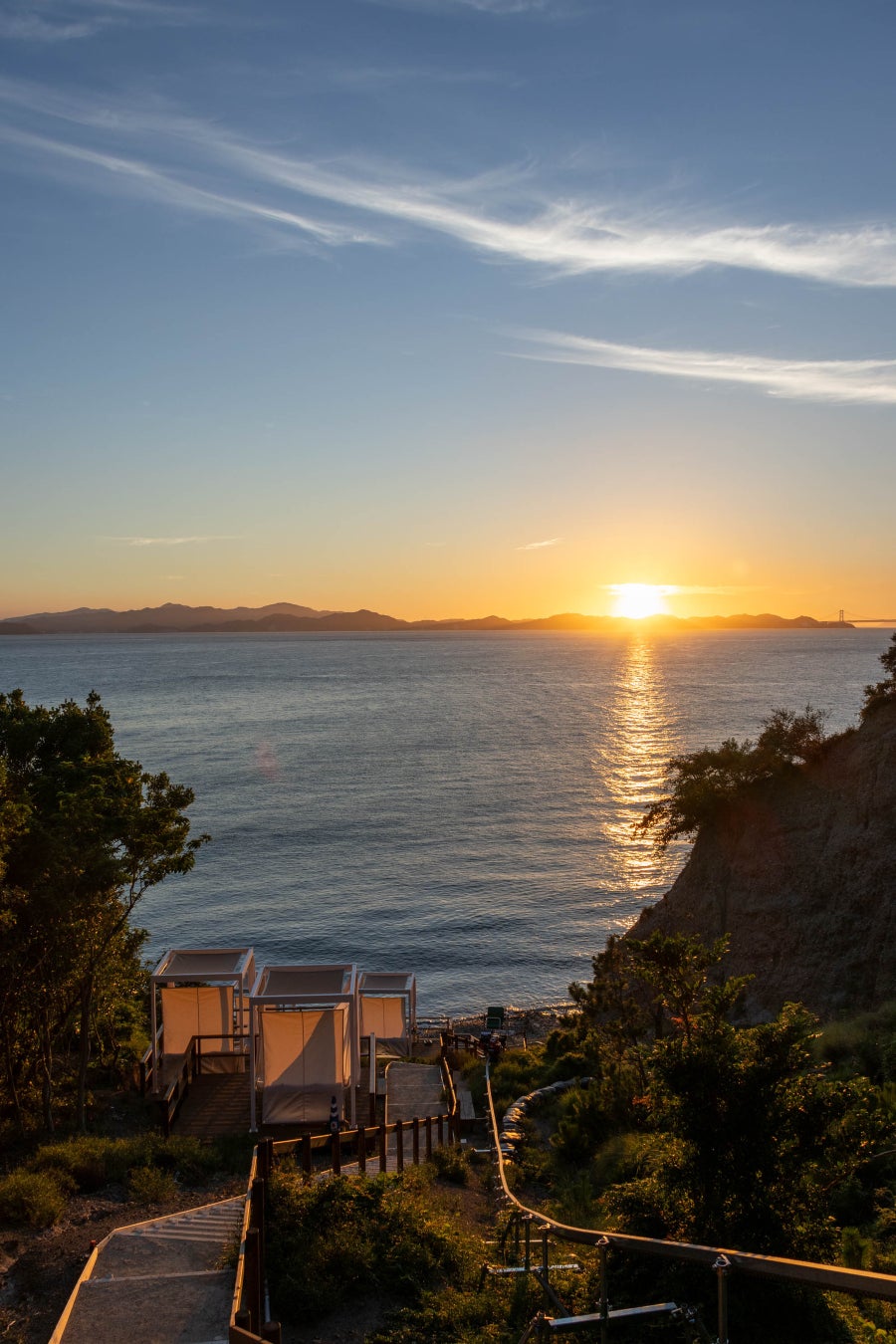 「TRATTORIA amarancia」からビーチへと向かう崖の中腹に設けられたこの「SUNSET CABIN」は、わずか4つだけの特別なプライベート空間です。目の前に広がる瀬戸内海と刻々と変化する空の色、日没、波音、風、そして夜の静寂までを、誰にも邪魔されずに味わえる極上の時間を提供します。